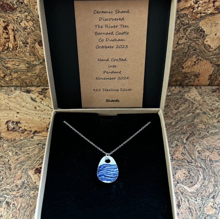 Hand crafted Jewellery and framed artworks using pre loved and discarded ceramics. Ceramic material will show signs of wear and damage. Entire process is a creative experience from discovery to final picture, nothing planned or preconceived. All materials personally collected from river banks, charity shops, roadside, woods, recycle centres, beaches, wherever dropped, dumped or donated ceramics are found, cleaned and shaped into new stories. Each piece comes with a short bio of where the ceramic came from, date found and re-created. Some shards collected are used as found, others are cut randomly which shape the final work. Every piece is individual, nothing replicated, however, due to repetitive patterns in ceramics there will be some similarity but only through the ceramic material not in the final piece.