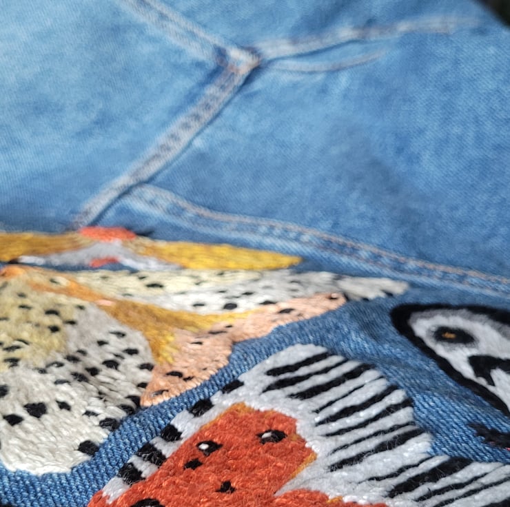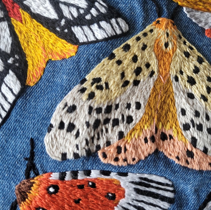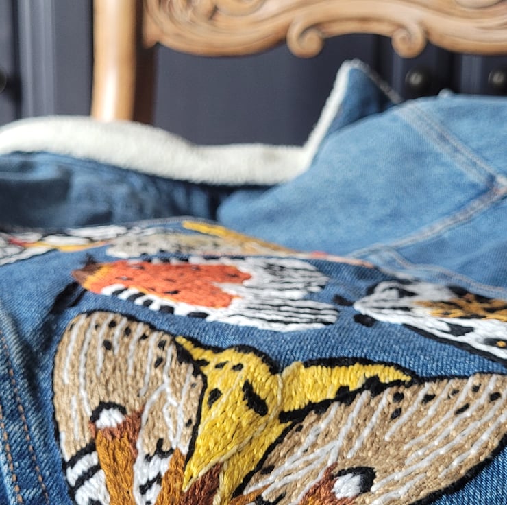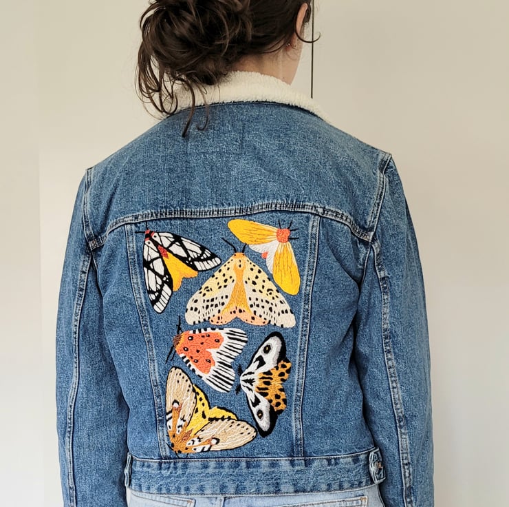 Sherpa denim jacket with a panel of hand embroidered moths.