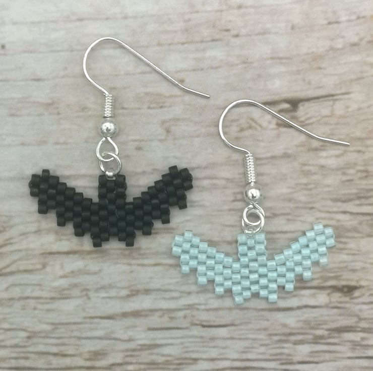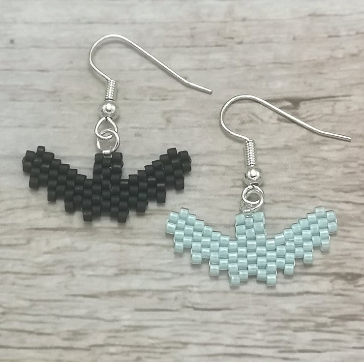 Hand stitched beaded bat earrings made using delica beads, one light blue bat and one black bat.