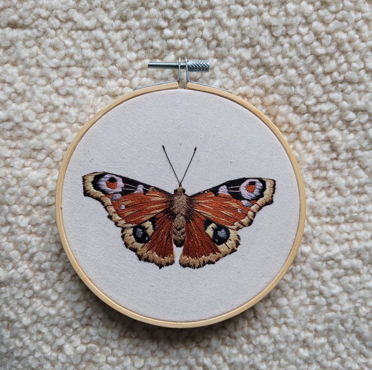 Hand embroidered Peacock Butterfly is stitched with cotton DMC threads onto cotton calico fabric and framed in a 13 cm bamboo hoop.