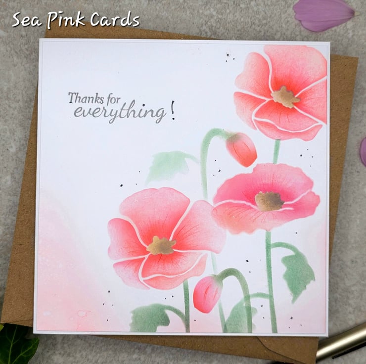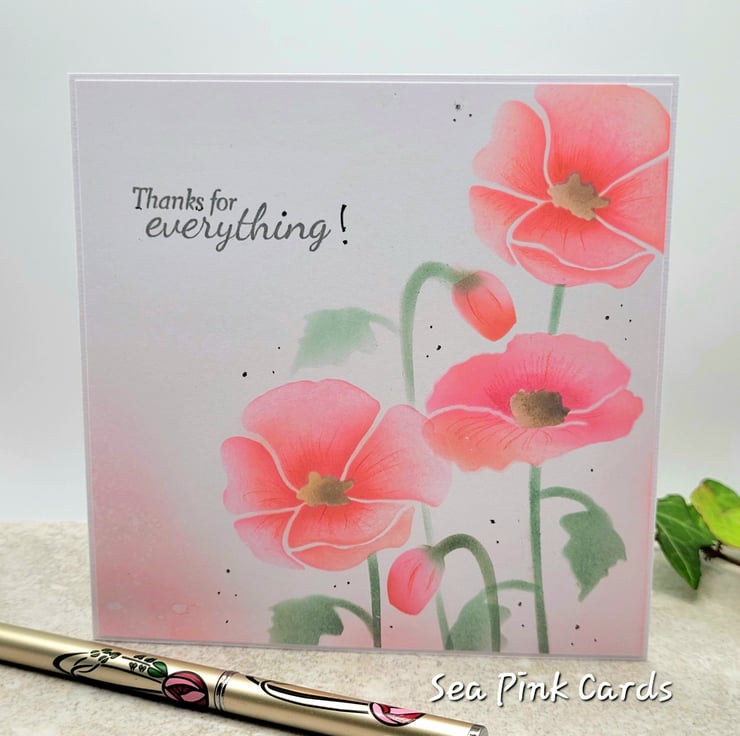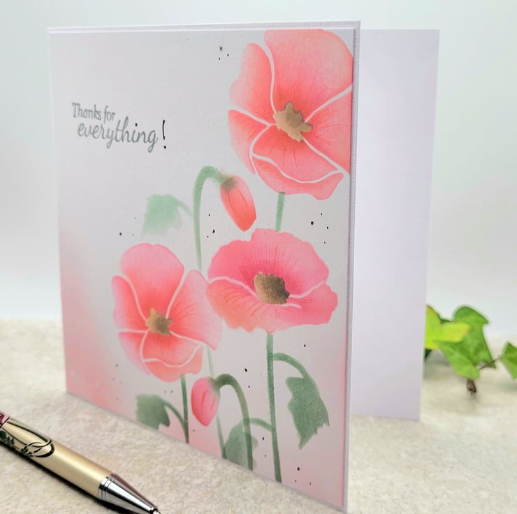 A thank you card, with the sentiment, Thanks for Everything! I chose pink poppies for this card as they represent kindness, appreciation and platonic love! Individually designed and handmade, this card will be delivered in plastic-free packaging.