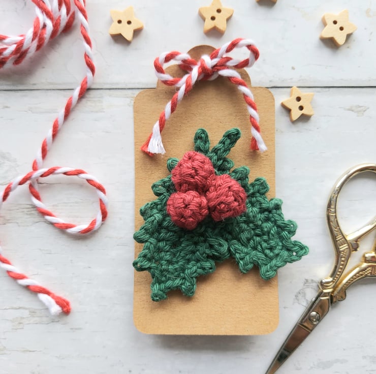Beautiful handmade crochet brooch of holly leaves and berries.