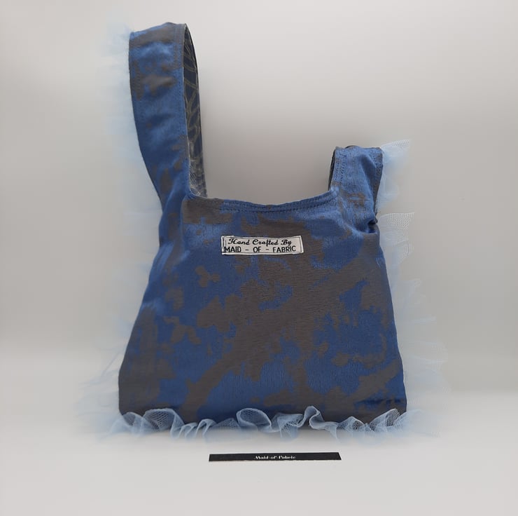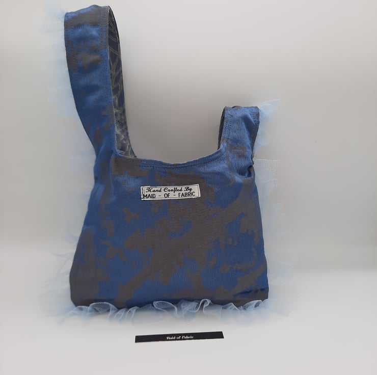 Small knot bag made using a two contrasting blue theme fabrics. It's reversible and has a mini light blue tulle trim on both sides.