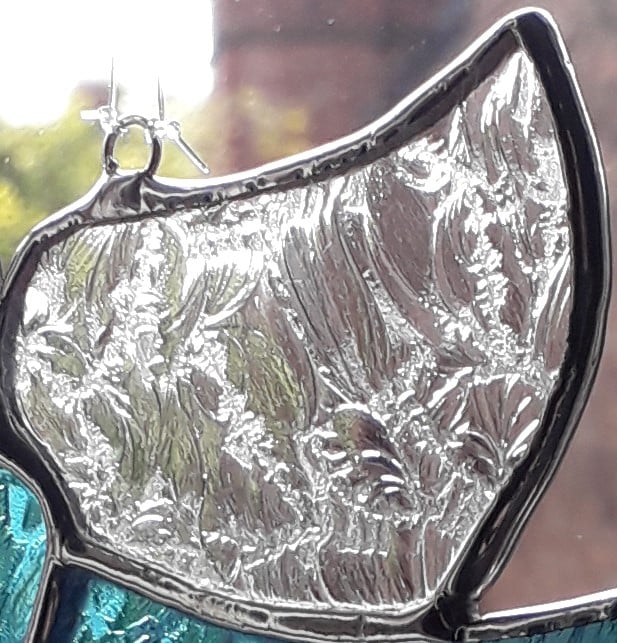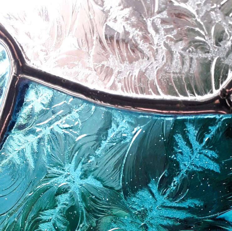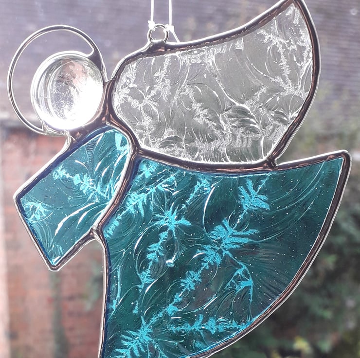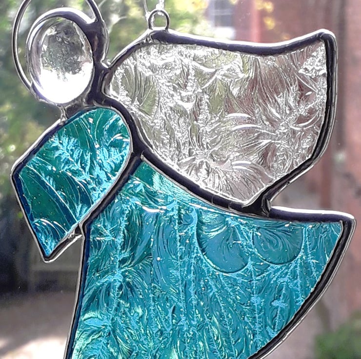 Our angel is made in beautiful Glue Chip glass that sparkles when there is light behind it and has an etched and frosted appearance. We have used aquamarine for the dress and clear Glue Chip glass for the wings. The angel is angled and appears to be flying through the air and will look great on your Christmas tree or hanging in a space where the light will catch it. Entirely hand-made, using the Tiffany method of glass making, each piece is cut by hand and shaped using a grinder. The edges of the glass are wrapped in copper foil tape which is burnished to the glass. The glass pieces are then soldered together using a fine and rounded solder bead. The angel is topped with a glass globule and a halo. We polish the finished angel and attach a hand tied loop so it is ready for you to hang in your chosen place.