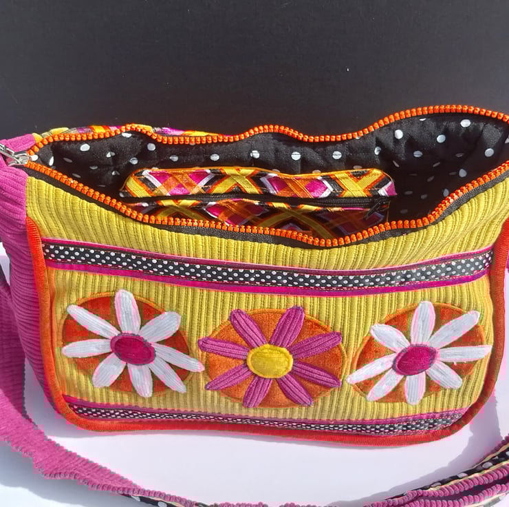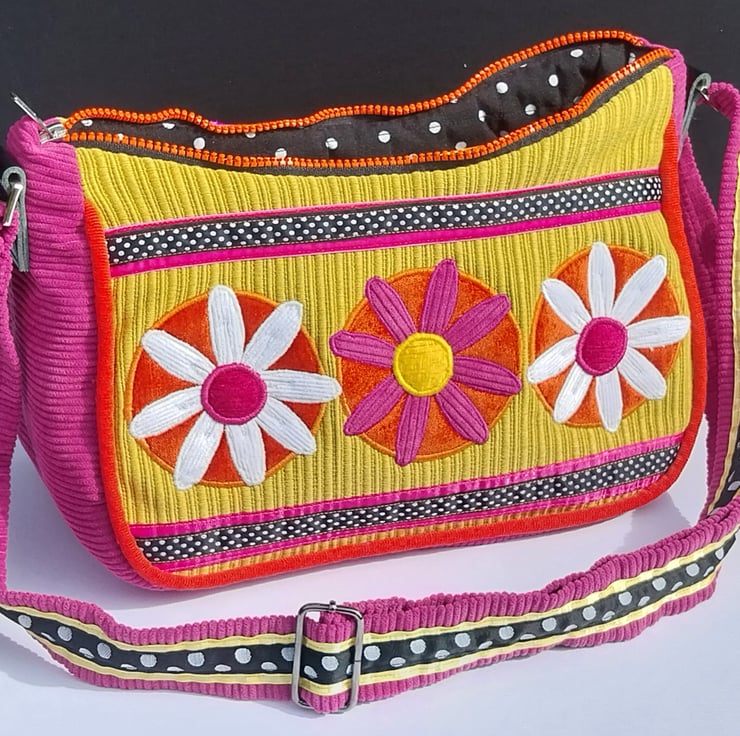 The front is a ribbed yellow cotton weave which has been over laid with three rich orange velvet circles which have then been appliqued with corduroy daisy petals with chenille centers.