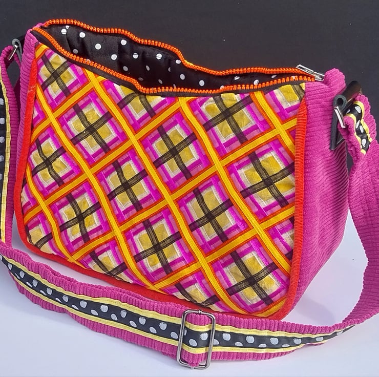 The sides are a raspberry pink corduroy which connects to the adjustable corduroy and ribbon strap with black leather straps and metal rectangular rings..