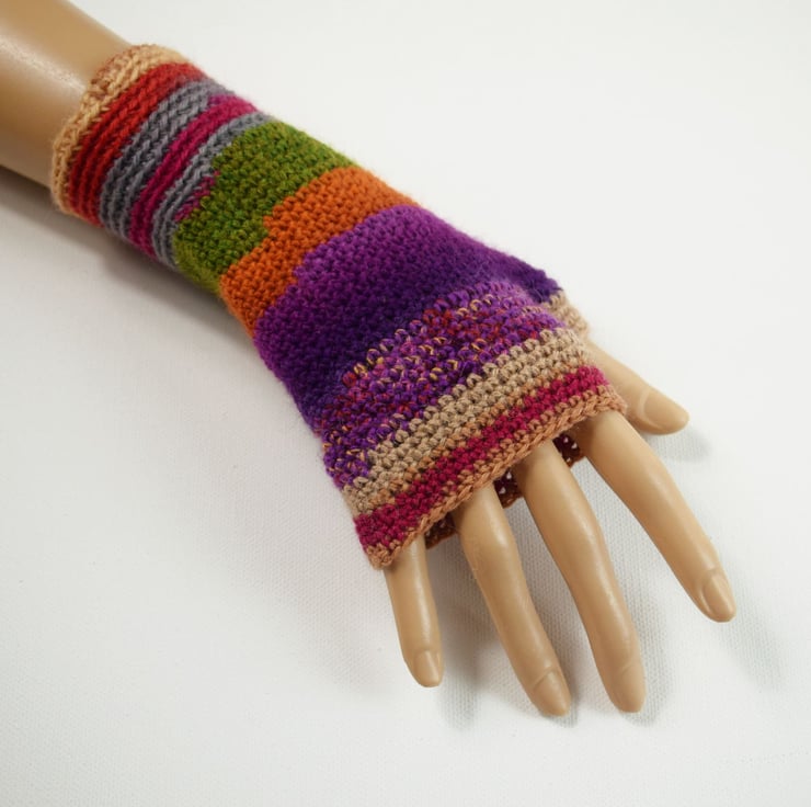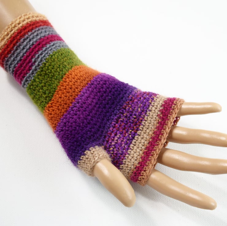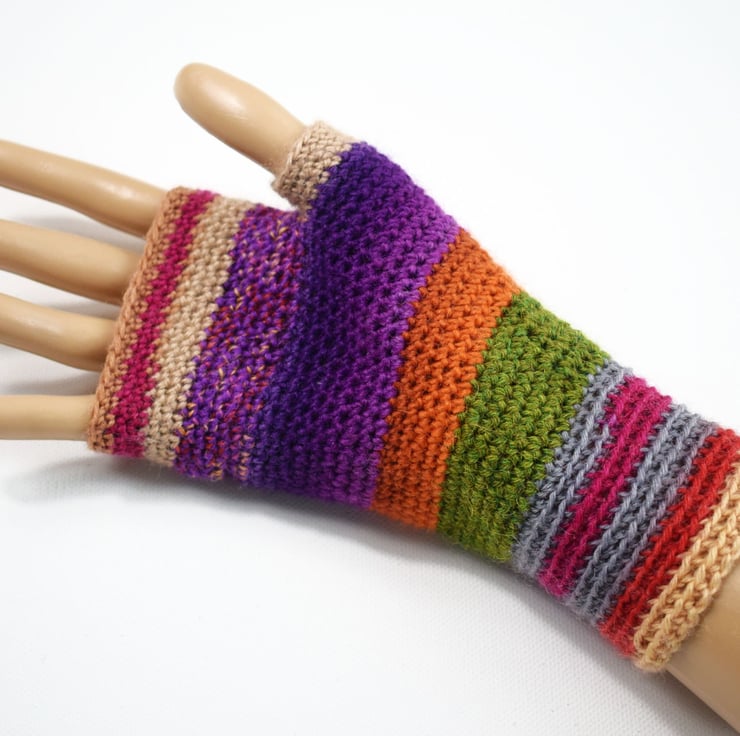 These fingerless gloves are sure to add some colour to dreary days and keep your hands toasty warm at the same time!