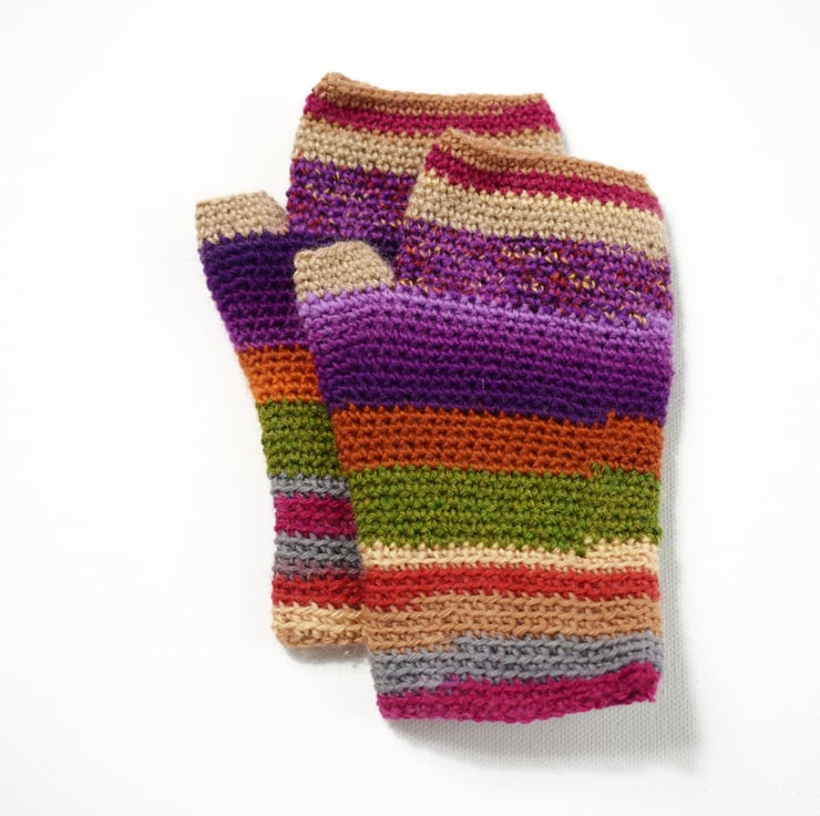 I have crocheted these gloves in lots of different wool rich, sock weight, yarns in a stripey design. The wool is all leftover from larger projects but as I like to throw away as little as possible every now and then I delve through my tiny leftover balls of wool and make a pair of these!