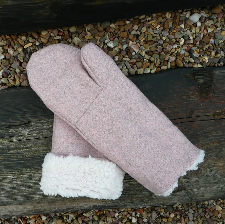 Ladies mittens pink grey marl wool tweed faux sheepskin sherpa fleece gloves
