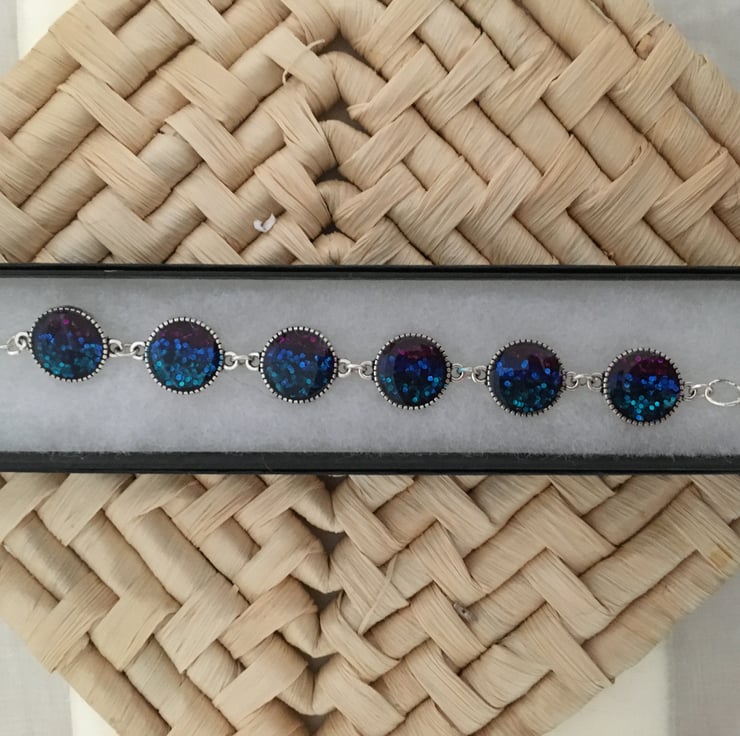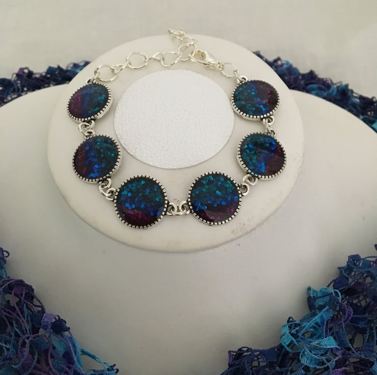 The colourful handmade centrepieces are created using a tri-colour base with a 2 part resin mix overlay. The colours gently reflect the light with a hint of a shimmer