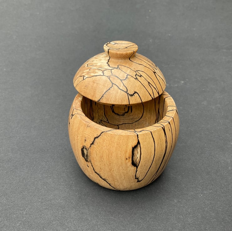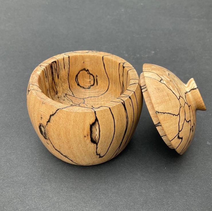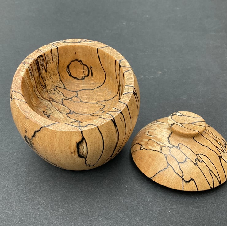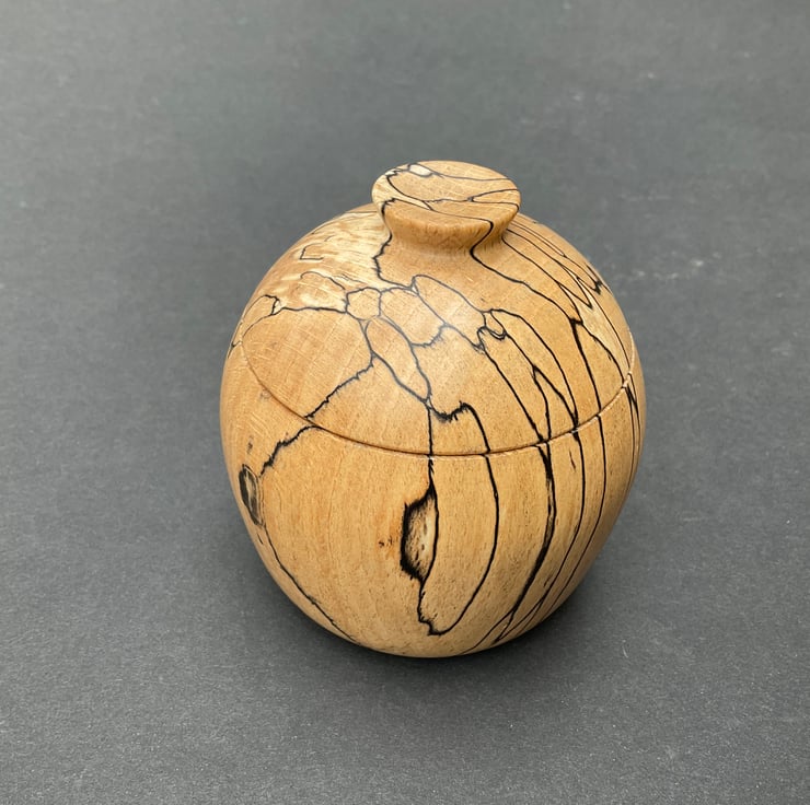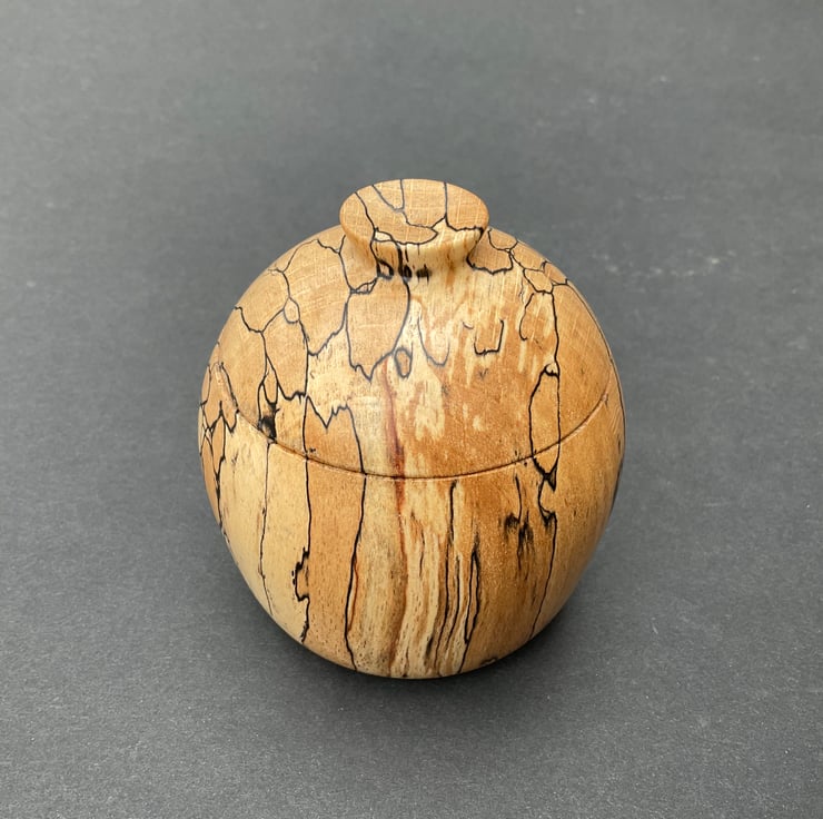 A unique wooden box with loose fitting lid, turned from Spalted Beech wood in the shape of an apple. The patterns in the wood which develop over time after the tree is felled and before it is processed give each item their own special unique pattern. The box is finished with danish oil and wood wax to give it a light sheen and protect it. To maintain the finish give it a light polish with wood wax. The box is approx 7cm by 7cm and could be used for storing small jewellery items or other small things. Would make an excellent gift.