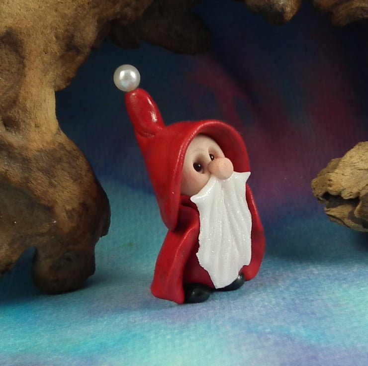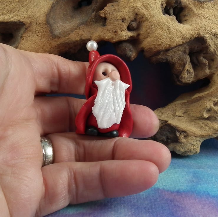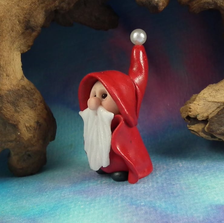 This is a 'one of a kind' creation having been entirely handmade without the use of moulds here at my studio on the Sussex Coast. Modelled with Prosculpt polymers, painted with heat set paints before sealing with lacquer, Nicholas Gnome has sparkling black onyx eyes and a snowy beard. Nicholas is just one and a half inches tall.