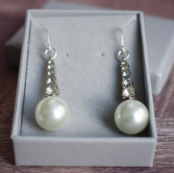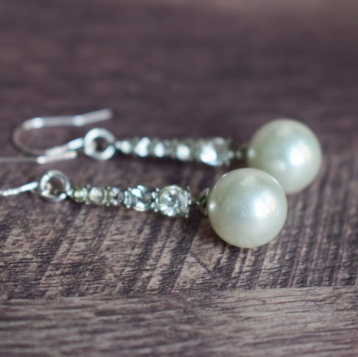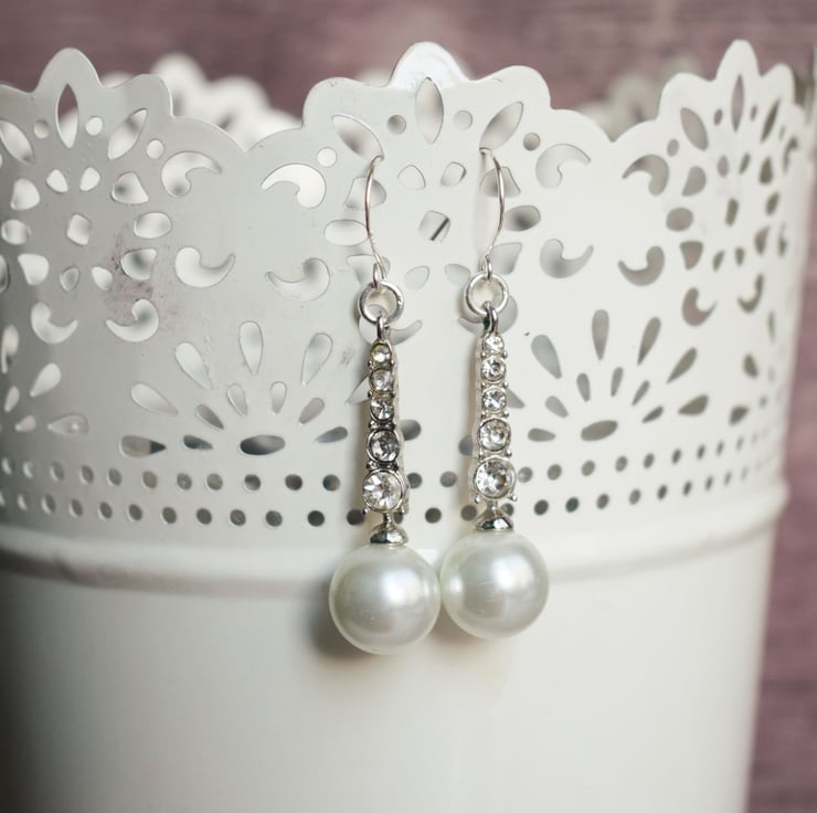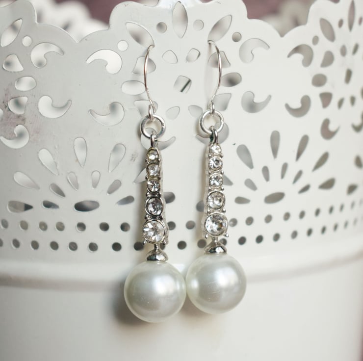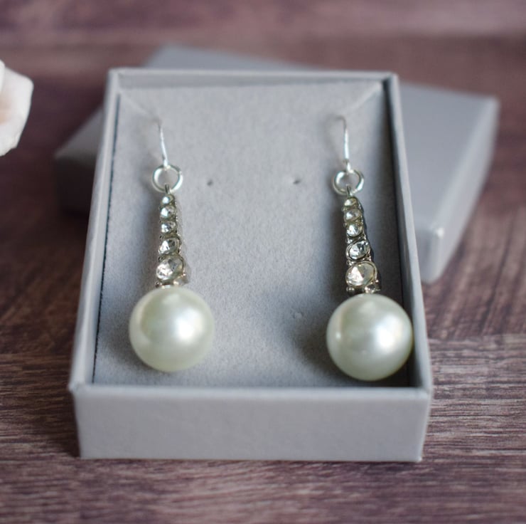 They have ivory pearls below diamante connectors that taper as they go up towards the sterling silver earwires. They are approx 5cm or around 2 inches long and the diamantes catch the light as you move.