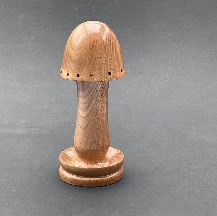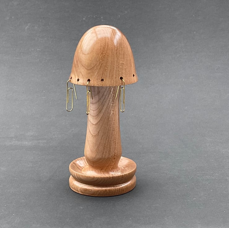 I love turning wooden items in the form of natural objects, in this case a toadstool reminding me of those that grow in my garden and giving it a new life as an earring holder.