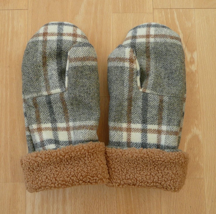 Ladies mittens grey cream wool tweed gloves teddy fleece lined mittens