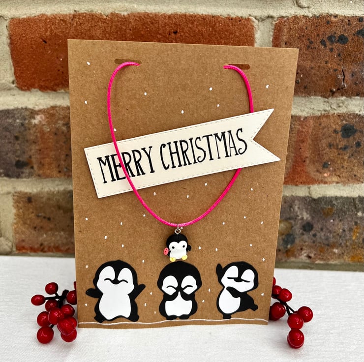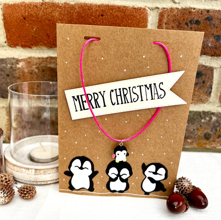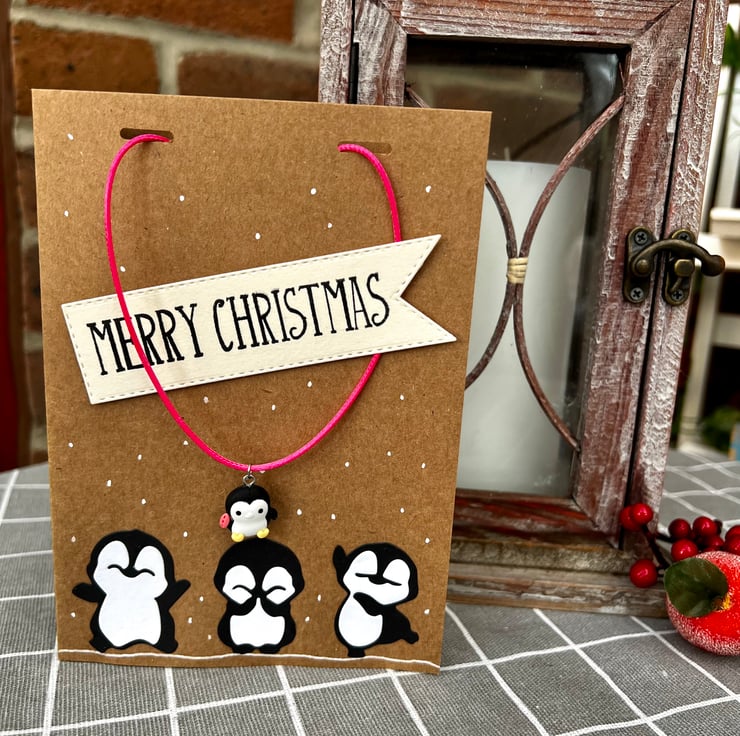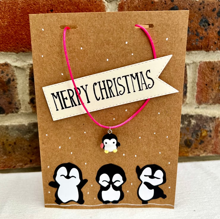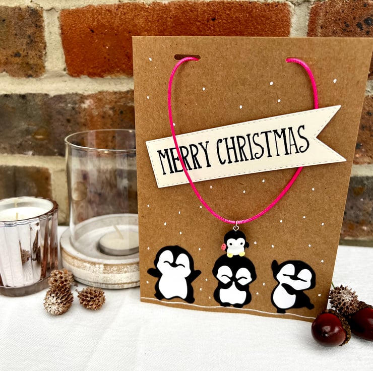 ‘Penguin Christmas’- Christmas Card including a Penguin necklace.