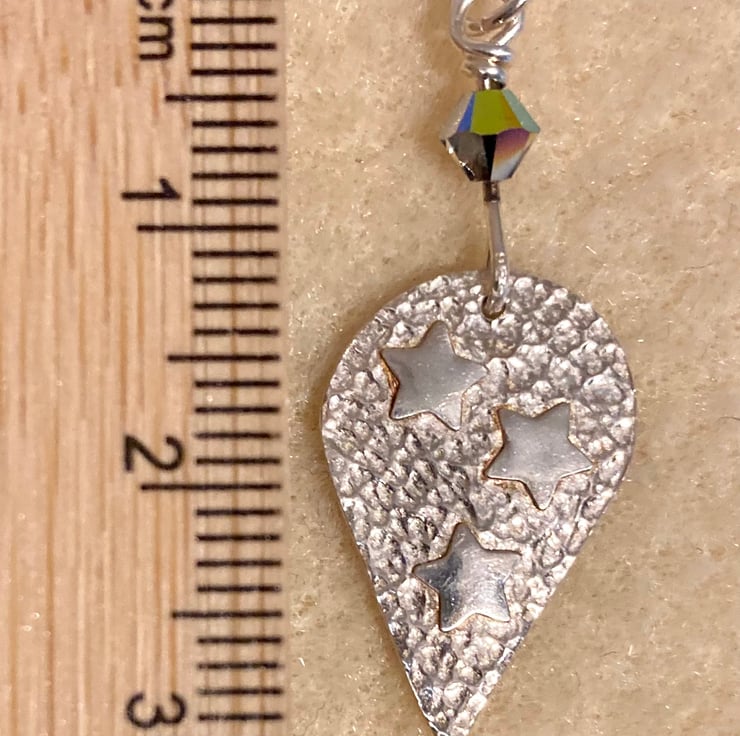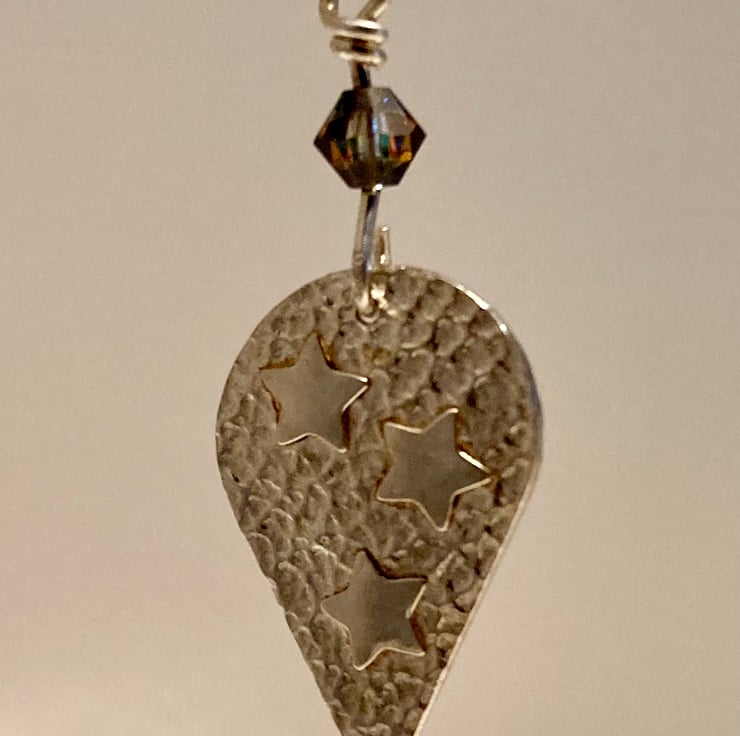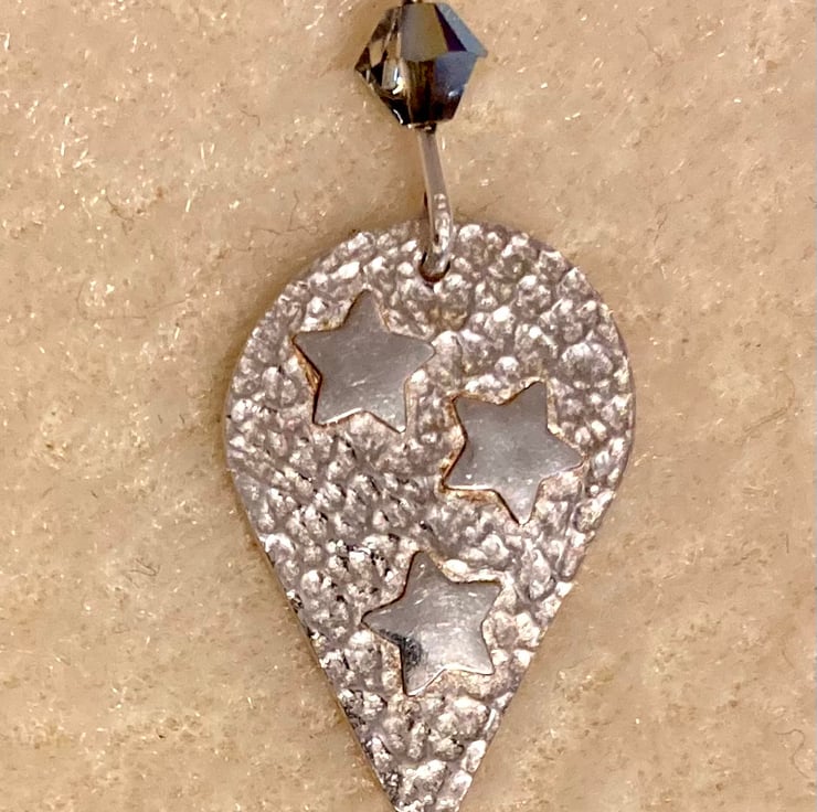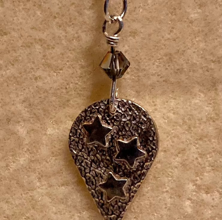 Inverted teardrop, textured necklace with three shiny stars, handmade in pure silver. On an 18” sterling silver twist chain.