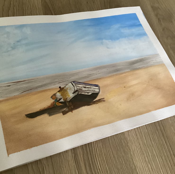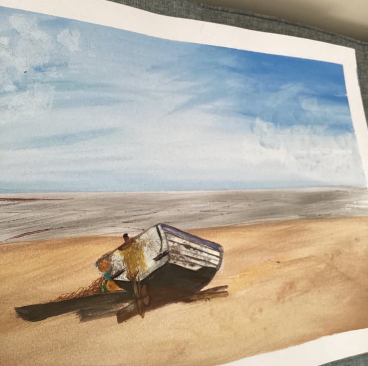 Watercolour painting on watercolour paper 15by 10.5 depicting a rustic boat on the lonely shore, pale shades, and light, blue sky.