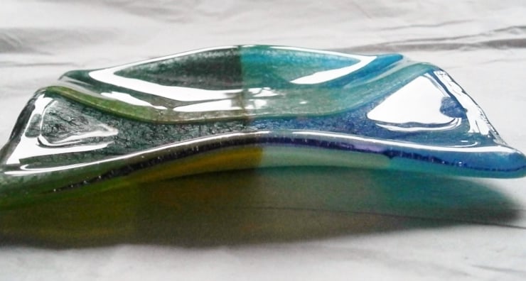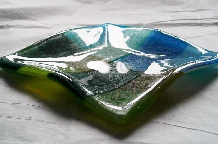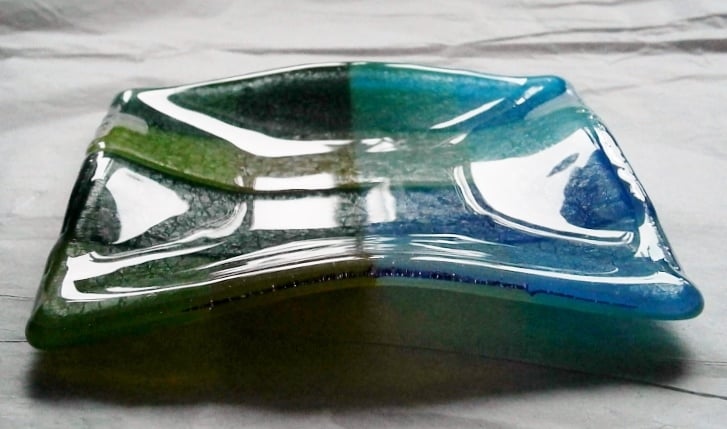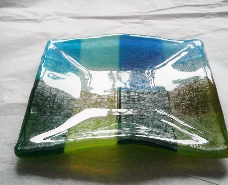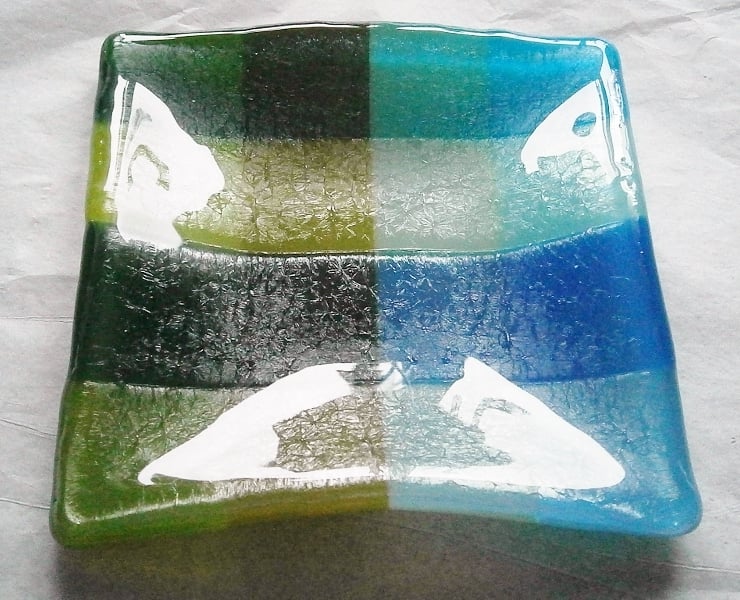 Square wavy dish hand crafted by fusing strips of glass in shades of blue and green to form a tartan effect.
