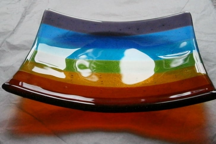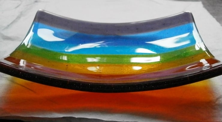 Hand crafted fused glass square dish in the colours of the rainbow.