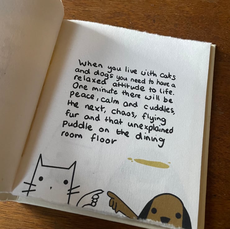 Also a love of bookbinding. All the animals have helped me in the process of making this book, the cats keeping me company in the middle of the night while I’ve been sewing signatures, the dogs sitting on my lap whilst I drew up the ideas.