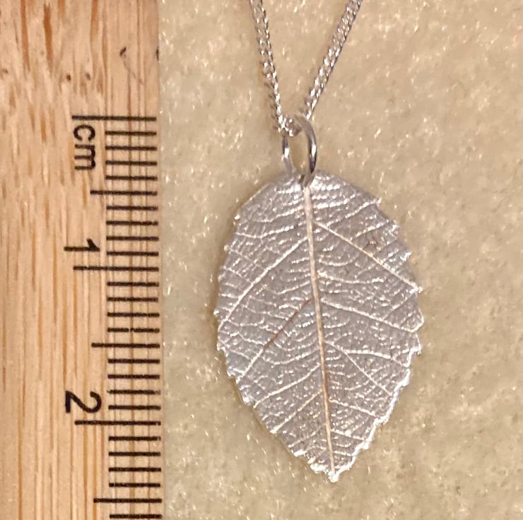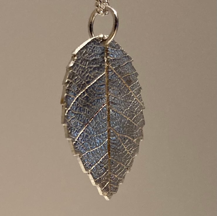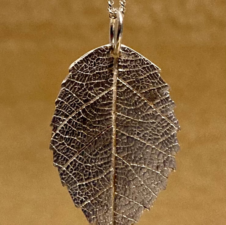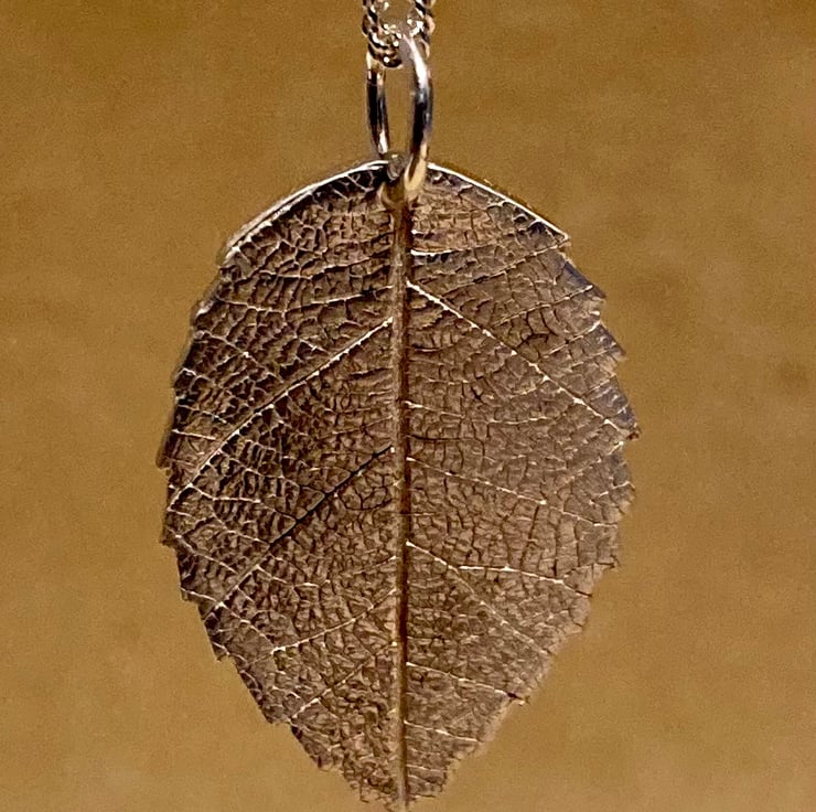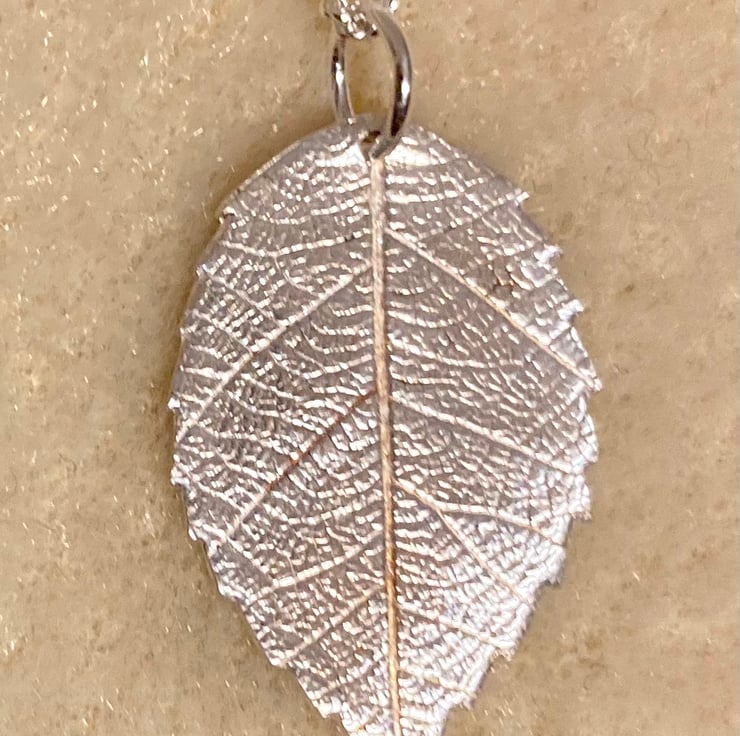 The imprint on this pure silver necklace was made using a real skeleton leaf, so no two could ever be identical! On an 18” chain with an adjuster at 16”.