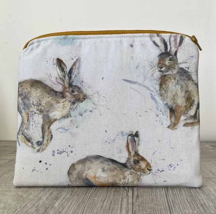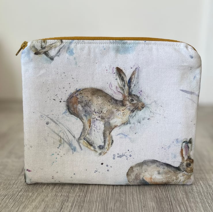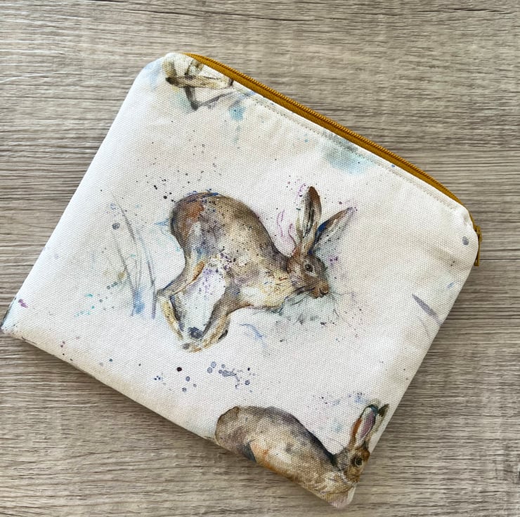Lined in cream calico, the bag has mustard coloured zip and measures approximately 19cm by 17cm. The background is a muted mustard colour/ochre. The outer fabric is upholstery weight 100% cotton. A thin wadding gives the pouch some structure.