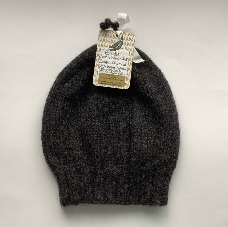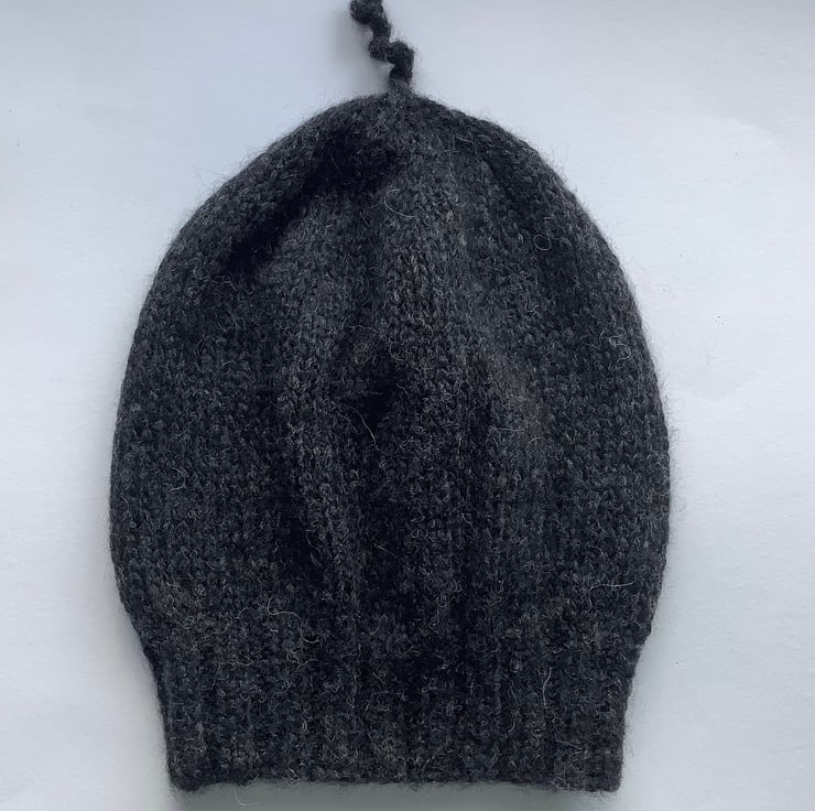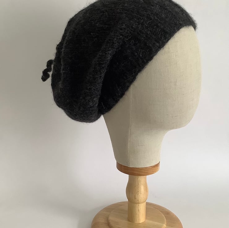 I have designed and knitted this slouch beanie / slouch hat in a delightfully soft, baby alpaca/ merino wool blend yarn . I've also added a cute little corkscrew curl to the top ! Very lightweight but super-cosy.