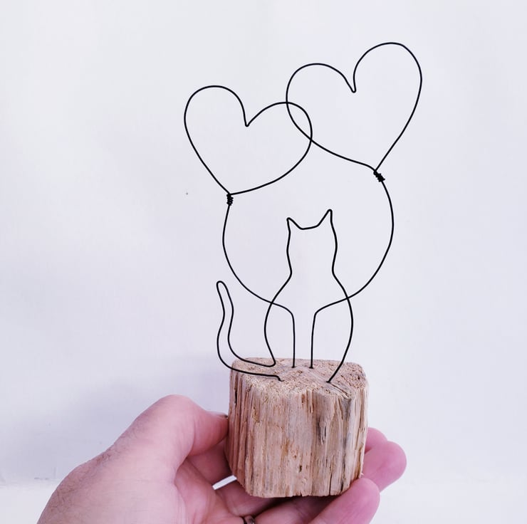 Driftwood base with two wire hearts looking over a wire cat. Perfect present for those cat loving couples.