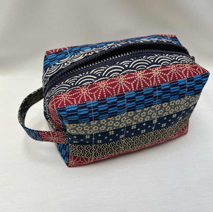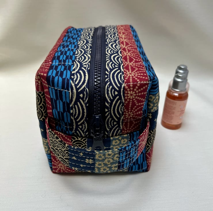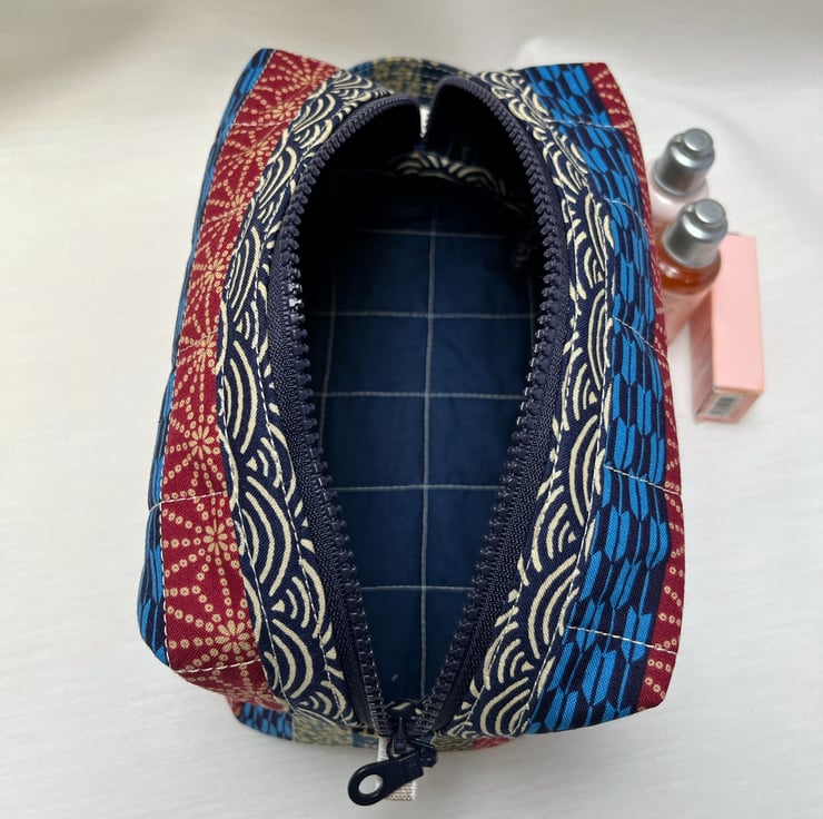 This handcrafted quilted cosmetic bag, or wash bag, has been created from a colour, patterned Japanese fabric. The fabric displays a variety of traditional Japanese patterns in reds and blues.
