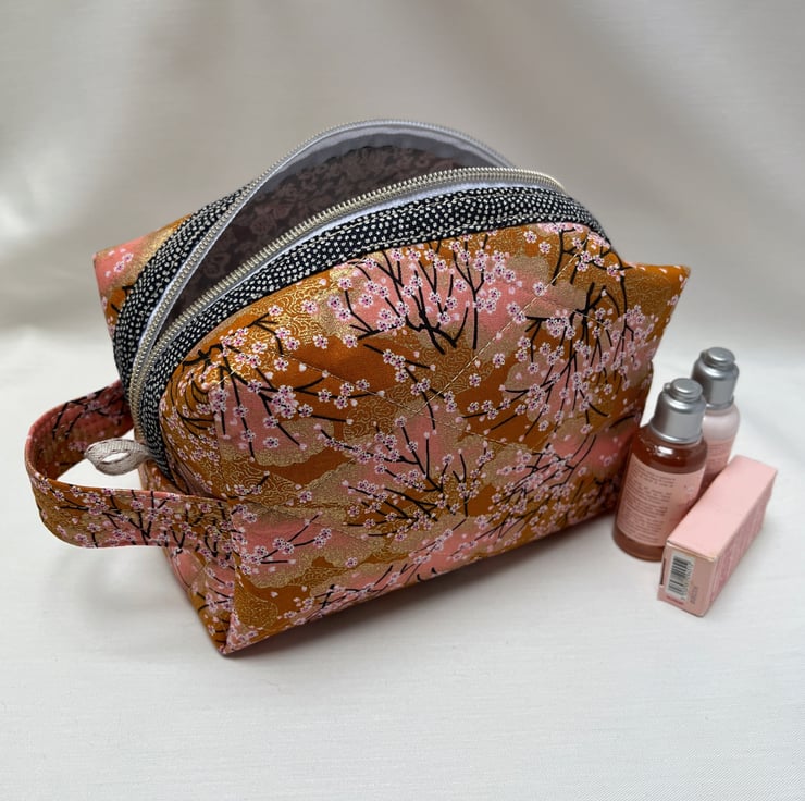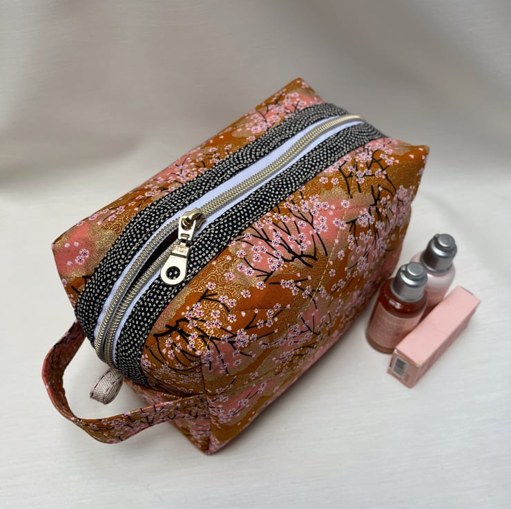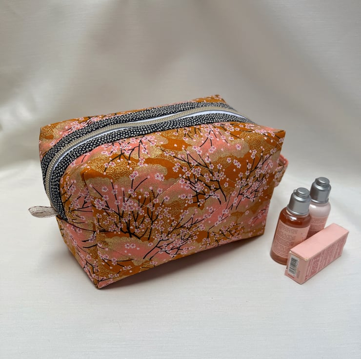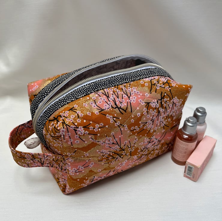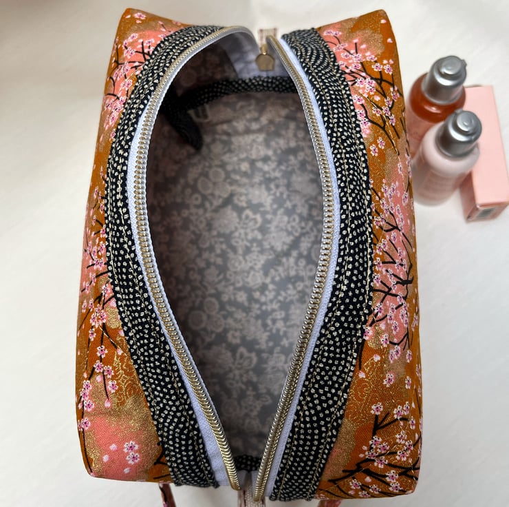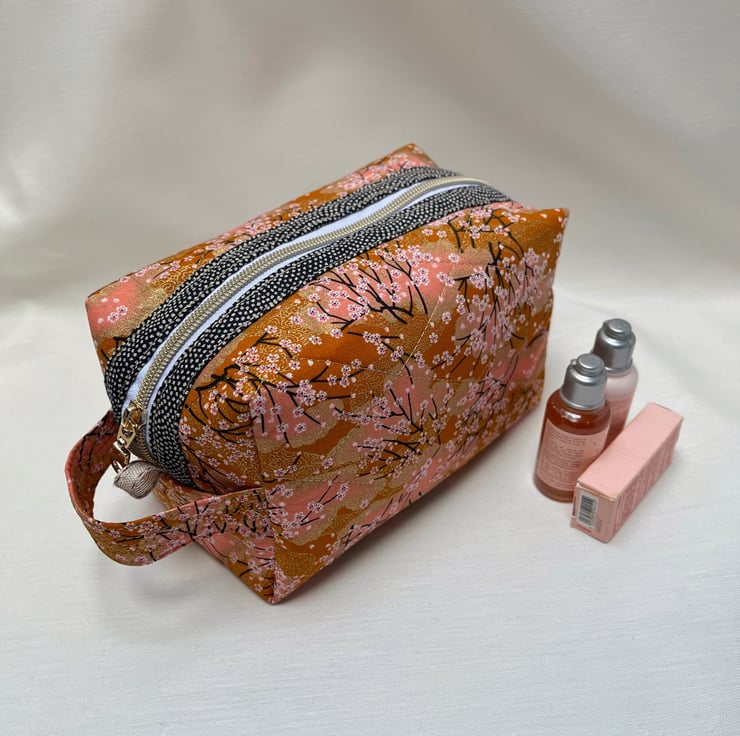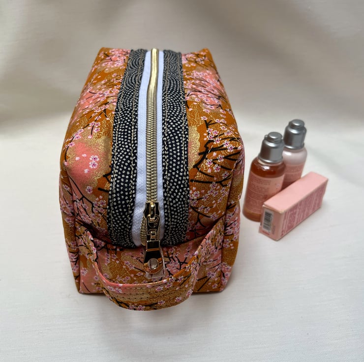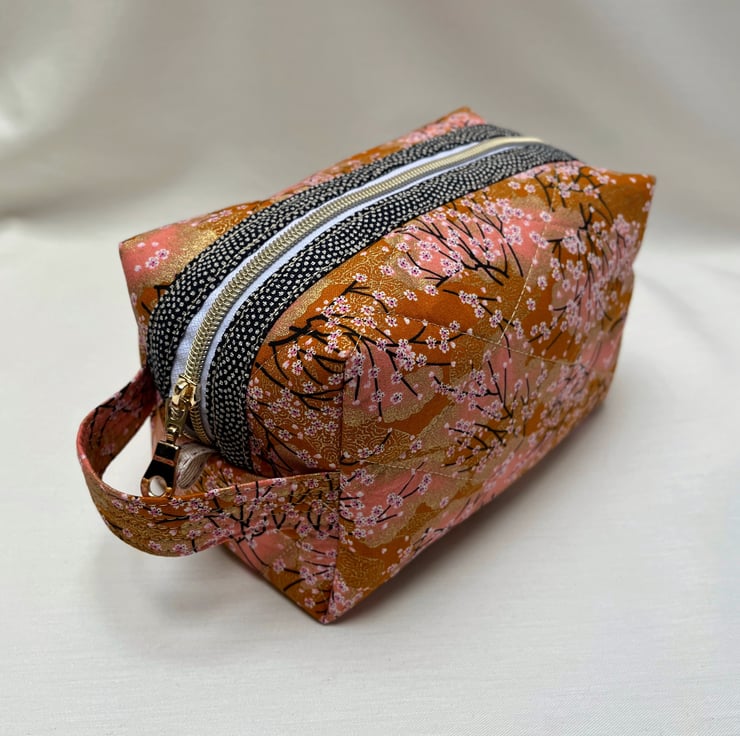 A beautiful peach Japanese fabric depicting tiny white and pink blossoms on fine black branches with gold gilding has been used to create this cosmetic or make up bag with a gold metal donut zip pull.