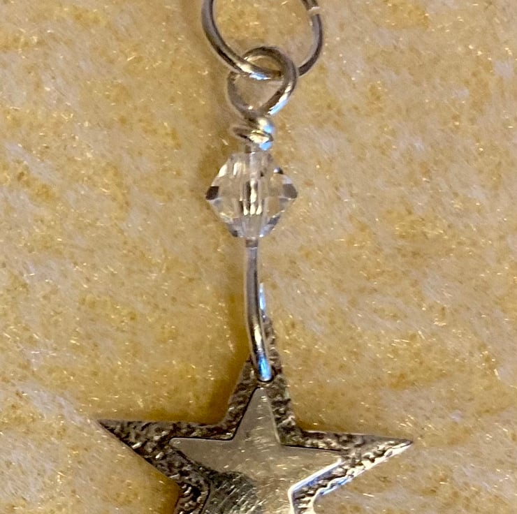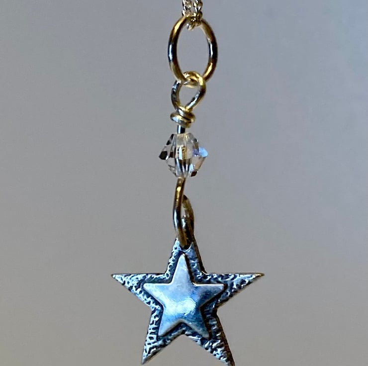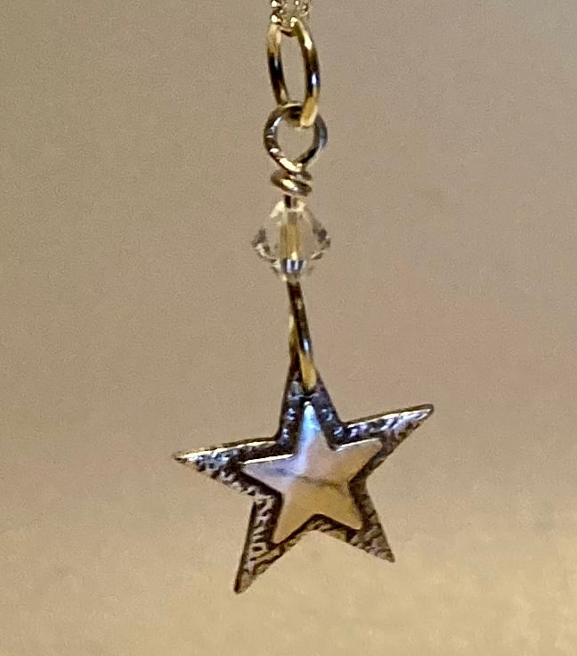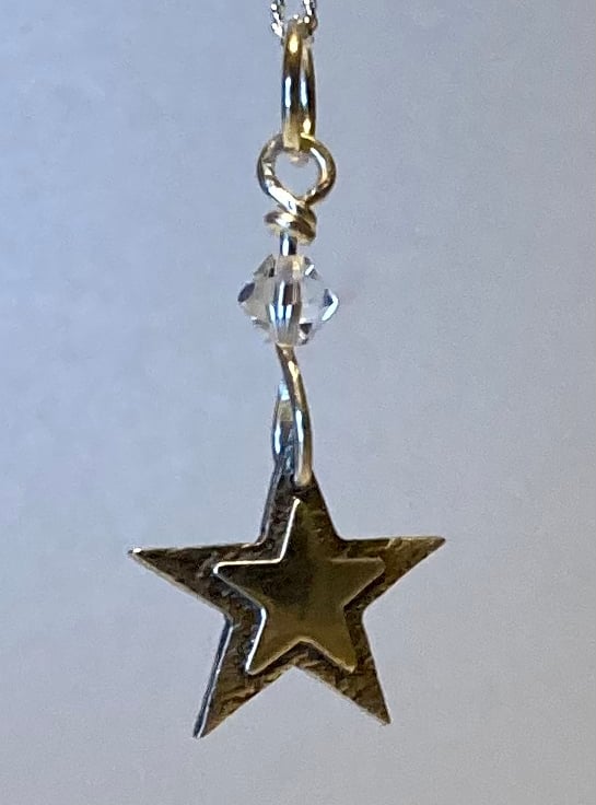 Textured star layered with a shiny silver star and finished with a clear Swarovski crystal. On an 18” chain with an adjuster at 16”.