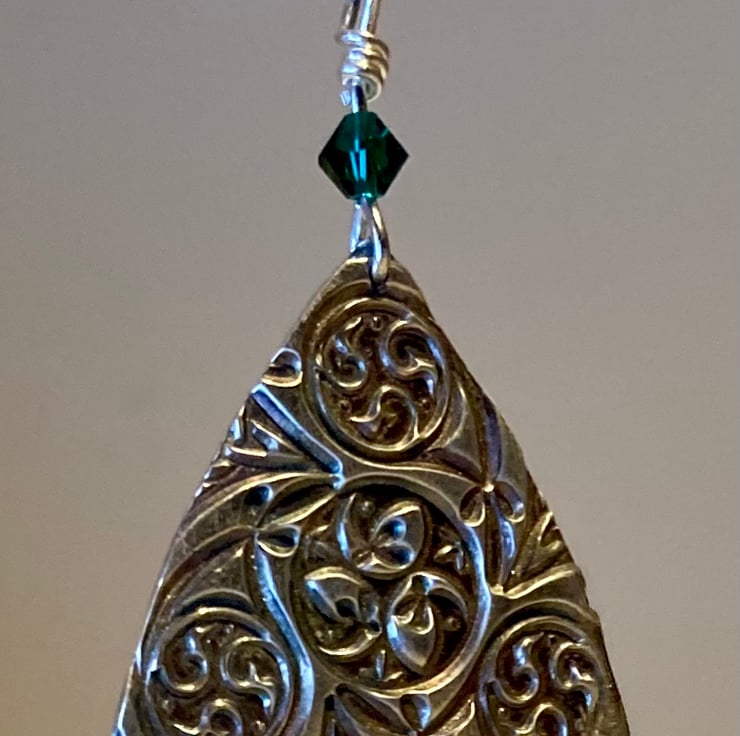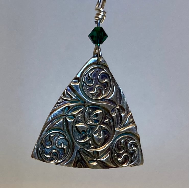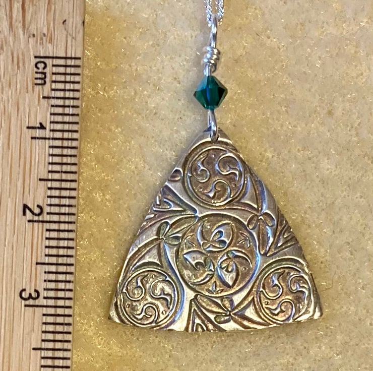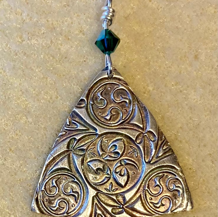 Beautiful triangular necklace with Celtic style pattern imprinted. Hangs below a green Swarovski crystal bead.