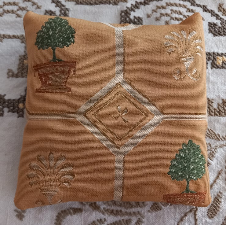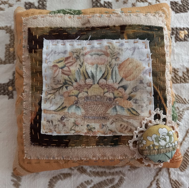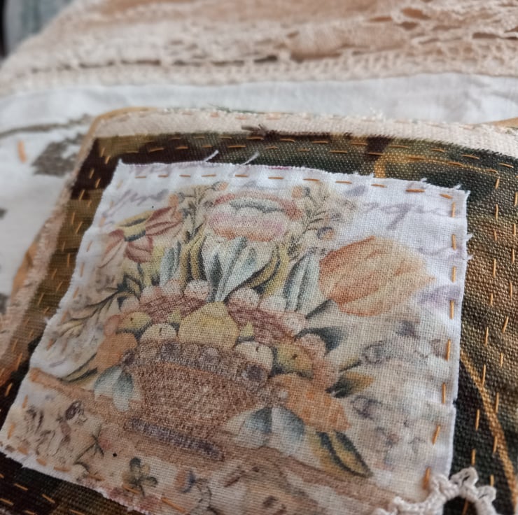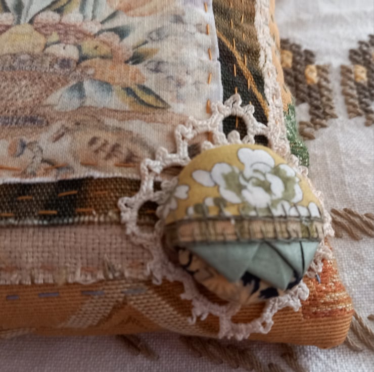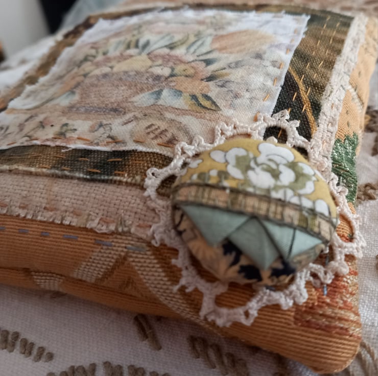 I used an image from Rachel at Roxy Creations (checkout her Instagram for her digitals etc) that I printed onto some vintage linen as the starting point for this lavender pillow. I used a fabric from a furnishing fabric sample to create the front and back of the pillow. I stitched the printed piece onto a piece of linen and added these to a piece of raw silk fabric before adding to the top of the pillow. I've added a handmade button on a piece of crochet lace.