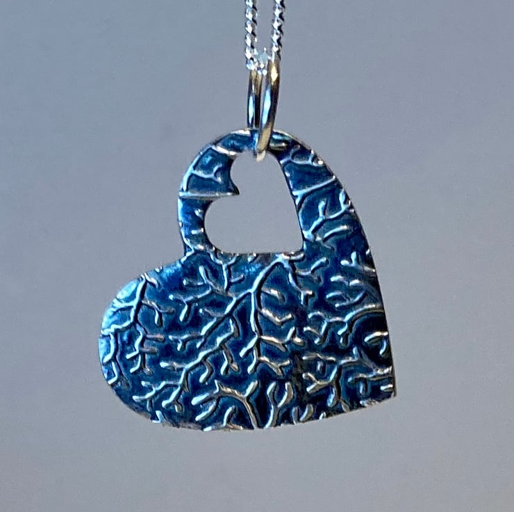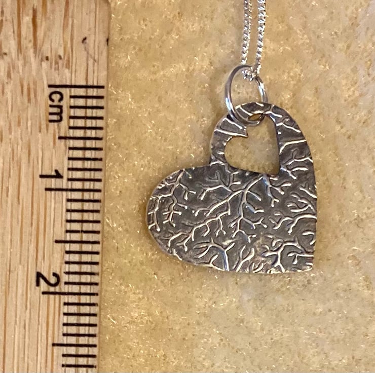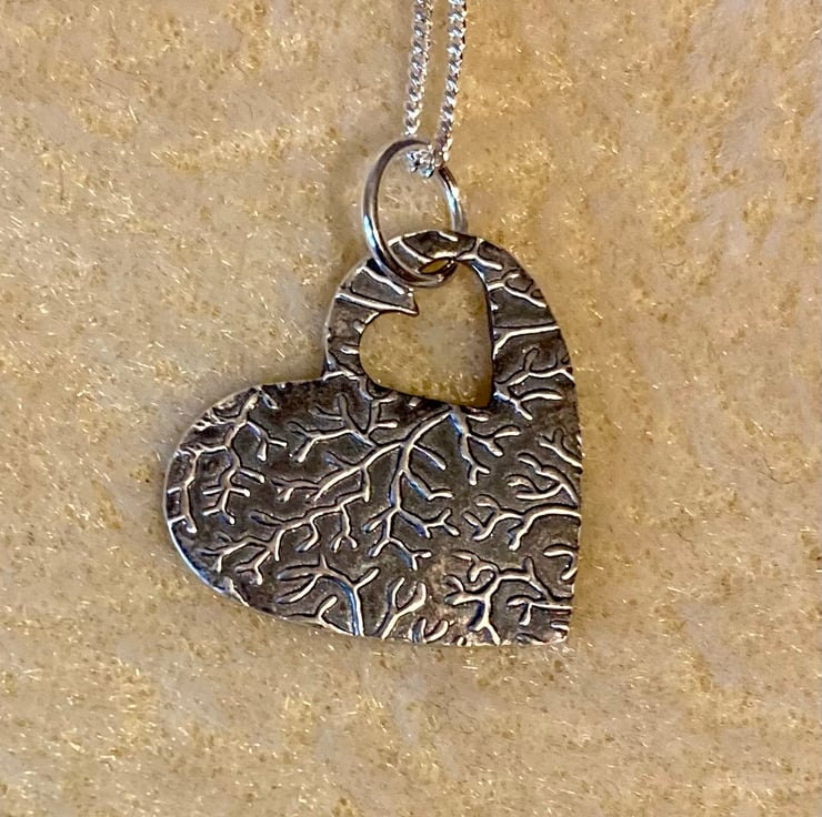 Pure silver heart necklace with a little cut out heart. On an 18” sterling silver chain with an adjuster at 16”.