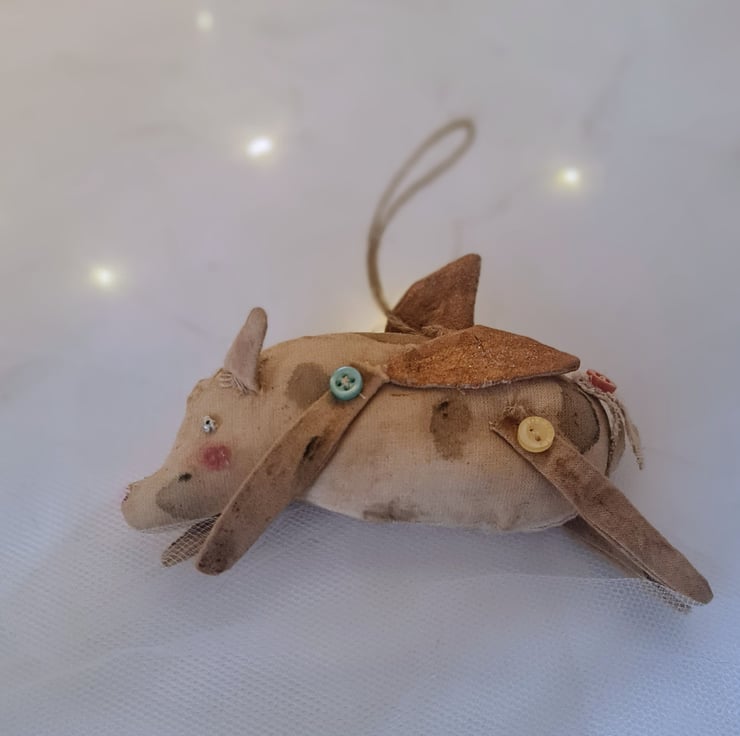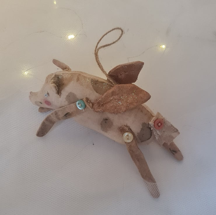 This little piggy is hand and machine stitichd in unbleached cotton. Hand stained and painted. He has bronze coloured angel wings. A vintage lace tail, with buttons on each leg and tail. Little silver beads for eyes. Jute string for hanging.
