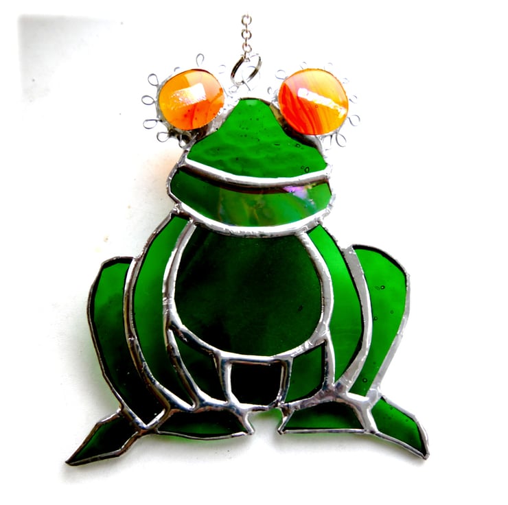 The suncatcher hangs from a little chain which is securely attached to the top of the frog between its eyes.