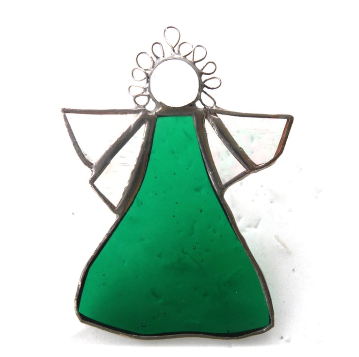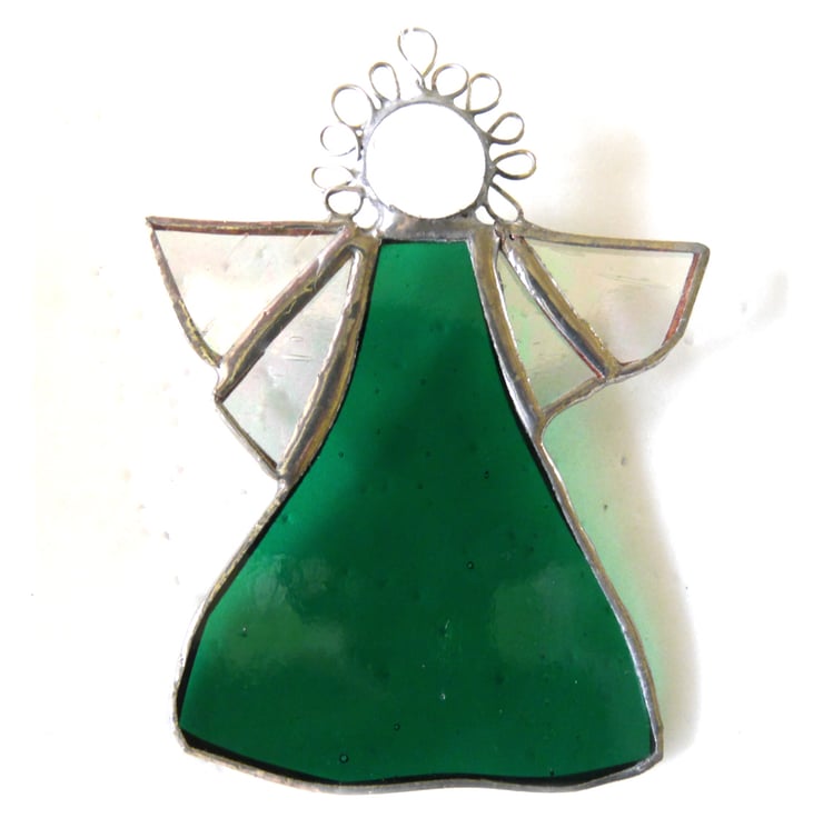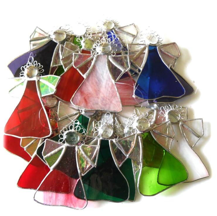 A stained glass suncatcher, an angel, made using the Tiffany copper foil technique.