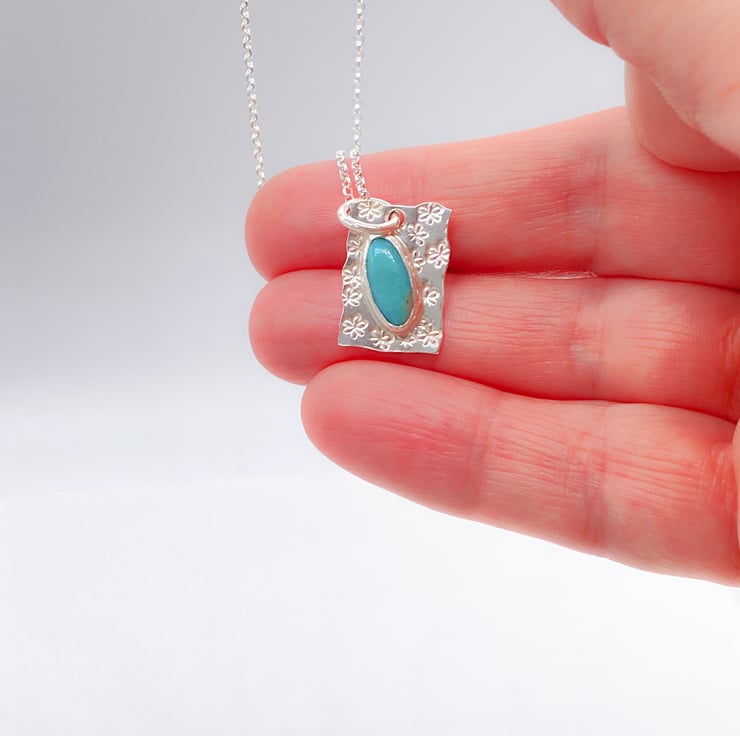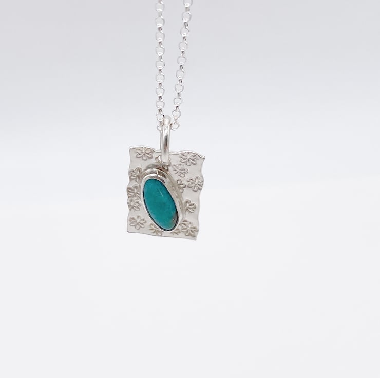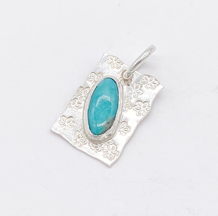 A bright Sanora Turquoise has been set in sterling silver and added to a pretty hand stamped backplate. Handmade in my home studio in Wiltshire using traditional metal smithing techniques.
