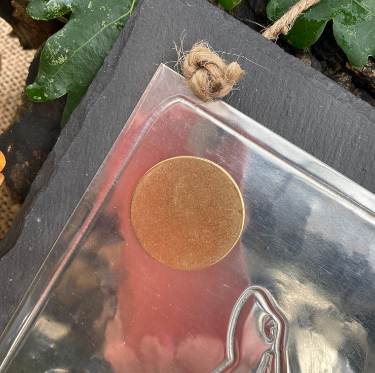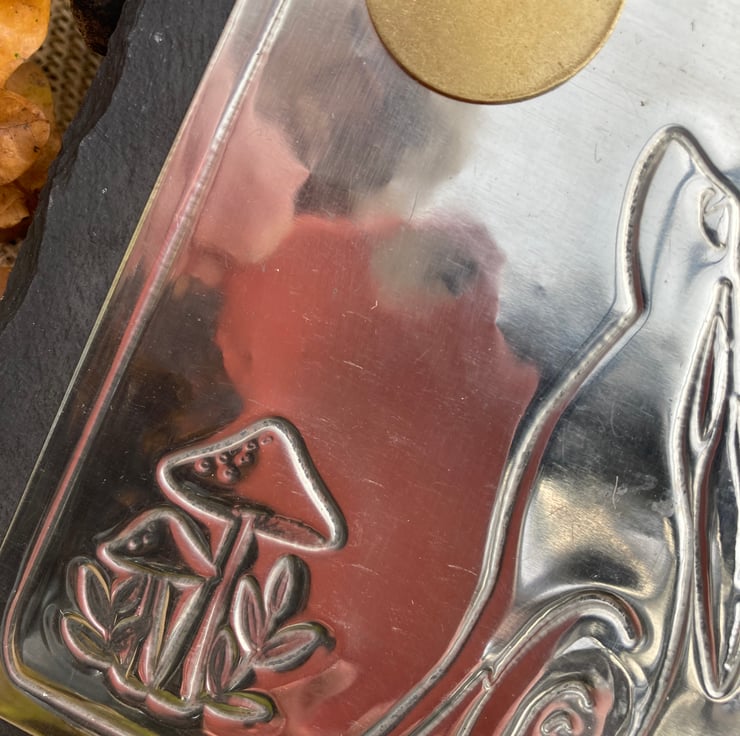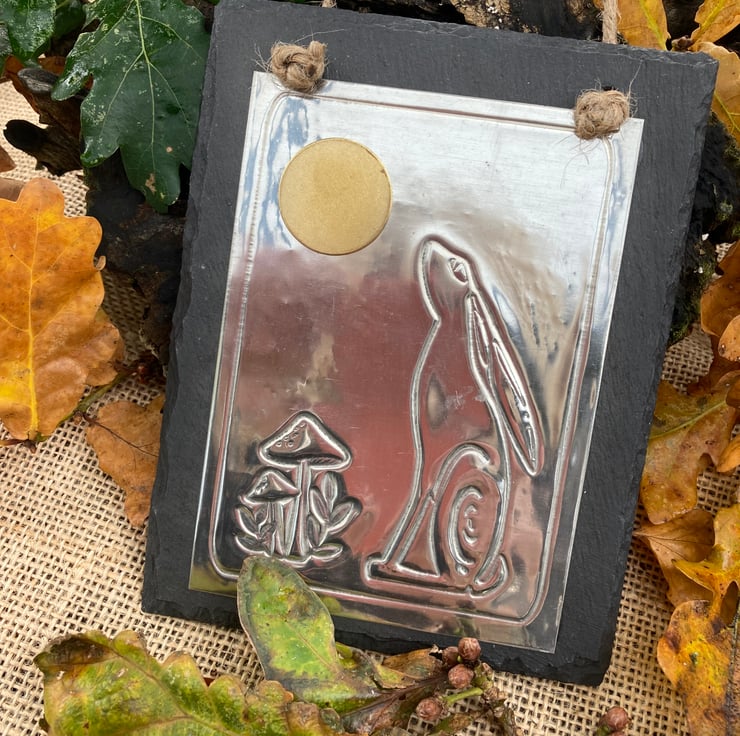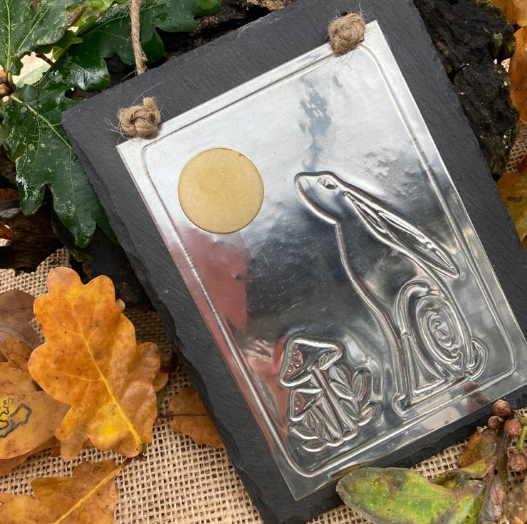 Beautiful pewter moongazing hare mounted on reclaimed slate with a coir string hanging loop. The moon is brass. Pewter doesn’t tarnish so this could hang outside if you prefer. Measures 17cm x 13cm.