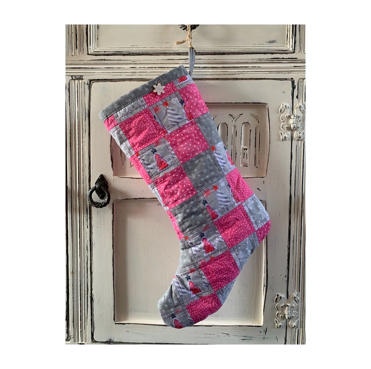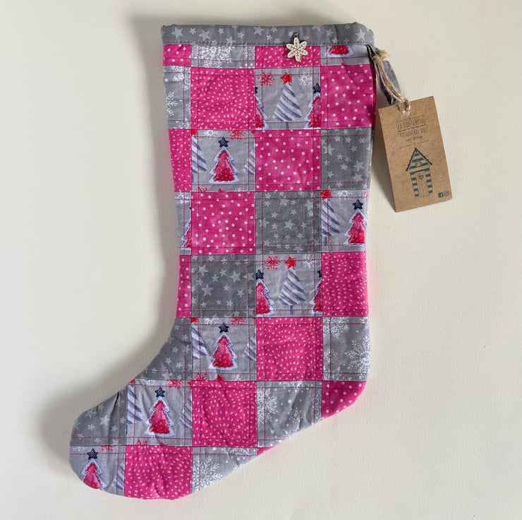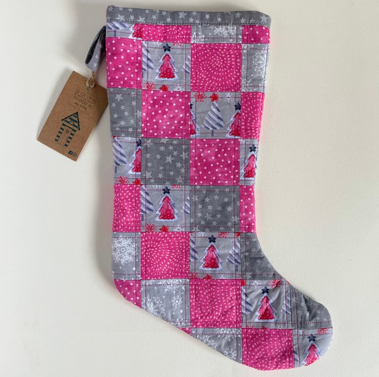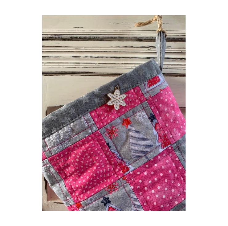Cute Christmas stocking. Pink and grey with cute xmas trees. Quilted and lined inside.