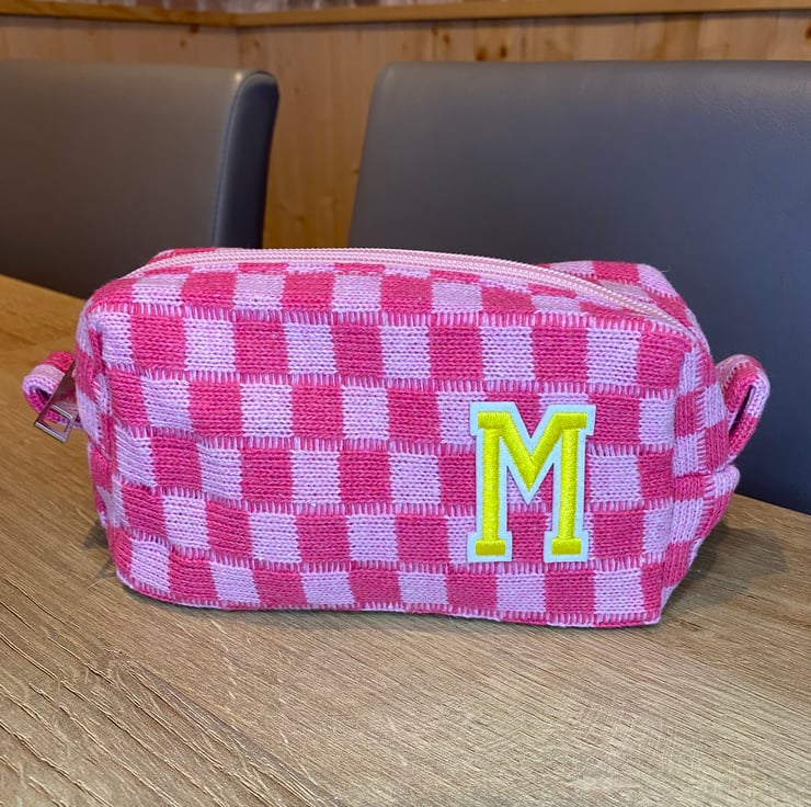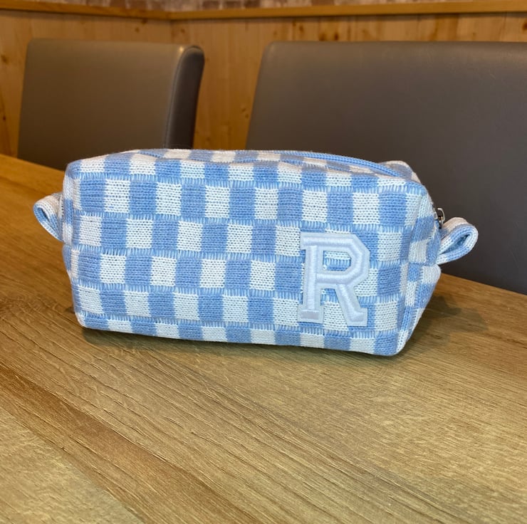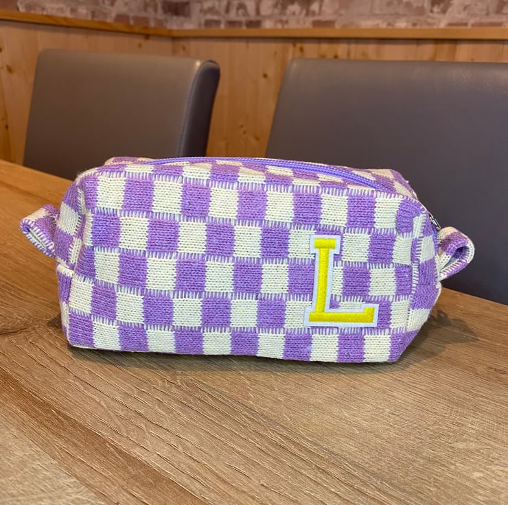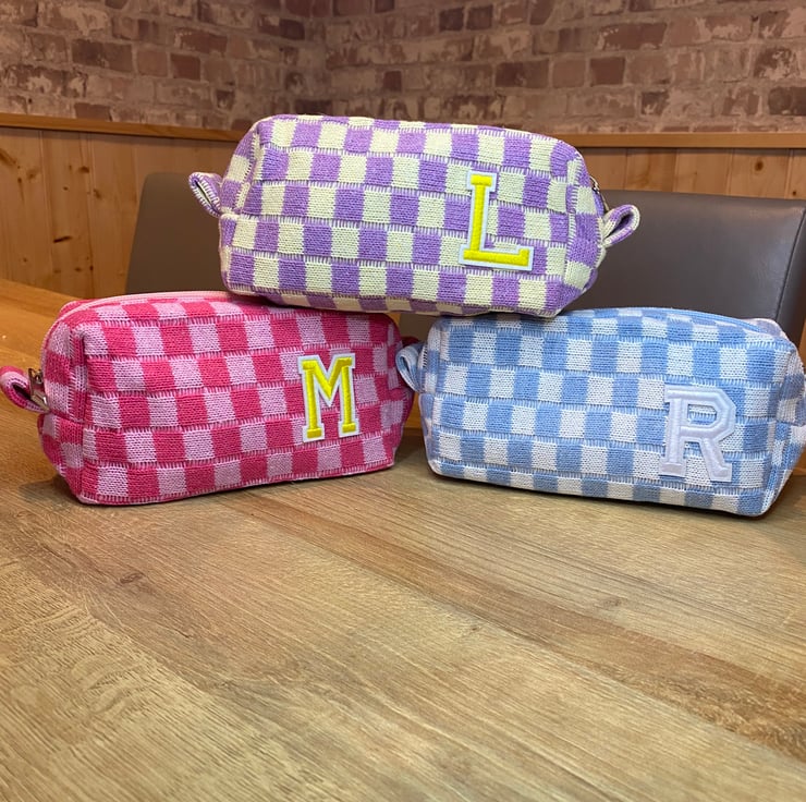 Personalised check make-up bag with an initial of your choice. Bags are available in purple/cream, blue/white and pink. Letter personalisation is available in gold or silver and is limited to one letter per bag.