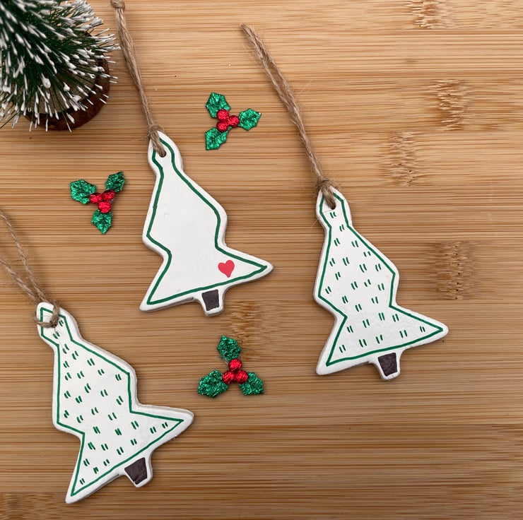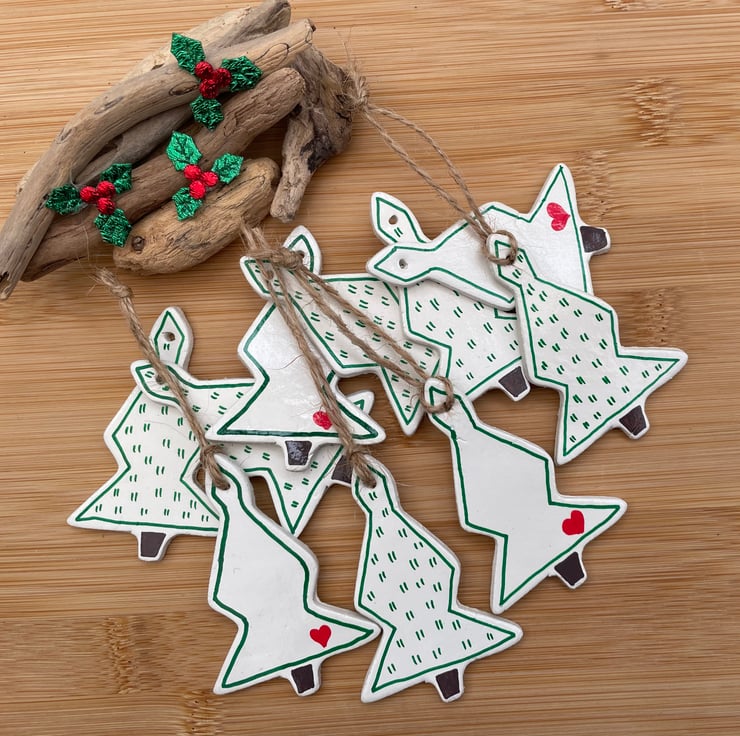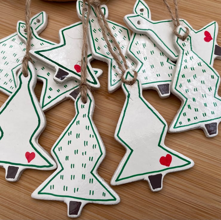 Hand Made Christmas Tree Shaped Decorations made from Air-Dry Clay.