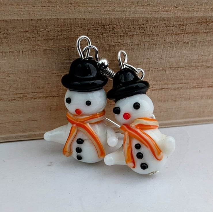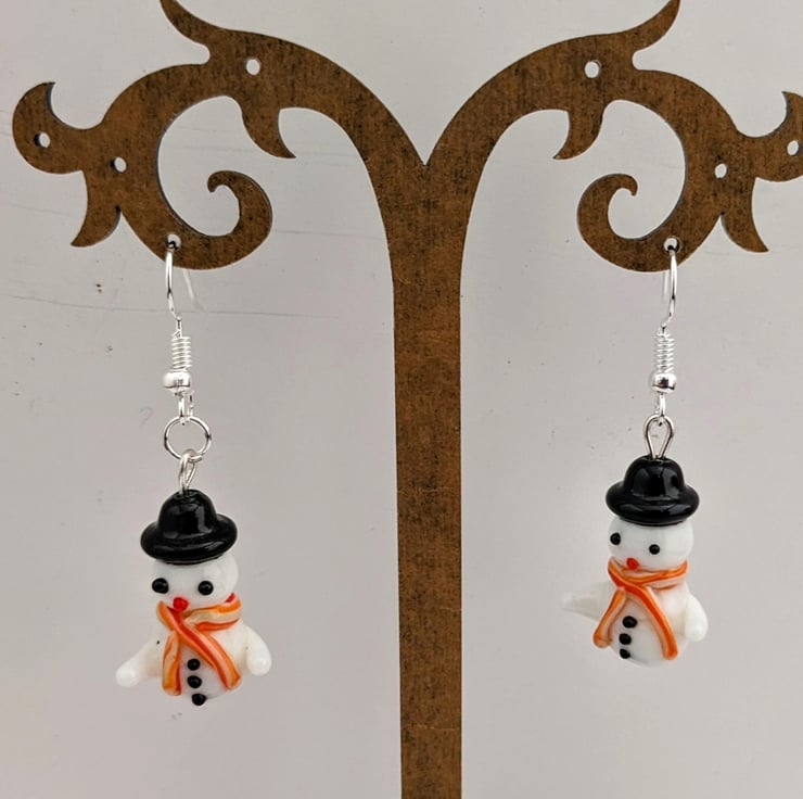 25mm glass snowmen on hypo allergenic silver plated hooks. In an organza gift bag.