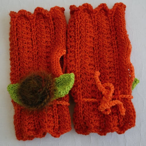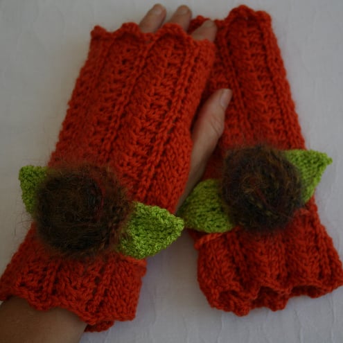 Snuggly fingerless gloves, or wristwarmers, knitted a soft pure wool, embellished with hand-knitted roses in a mohair yarn.