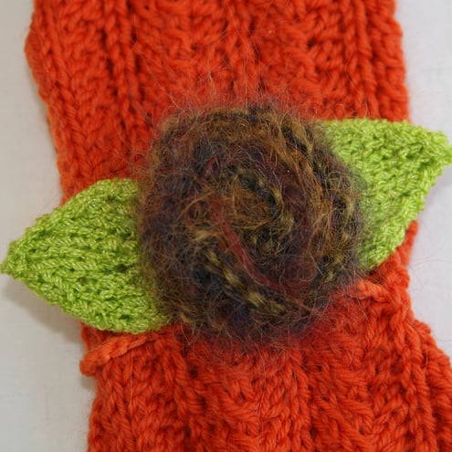 Photographed on a medium-sized hand, the lacy stitch will allow them to adjust to a larger size. A crocheted cord is tied in a bow on the inside of the wrist and can be re-tied to give a comfortable fit. The roses are knitted in a mohair yarn and the leaves in a fine pure wool. The thumb slot edgings, and the tie cord, are crocheted in a toning orange ribbon yarn.