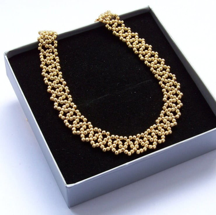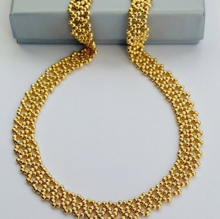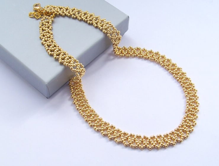 This delicate bead necklace was handmade of beautiful gold galvanized seed beads.