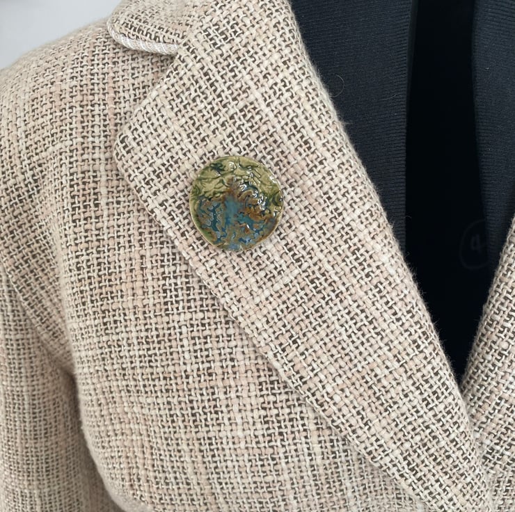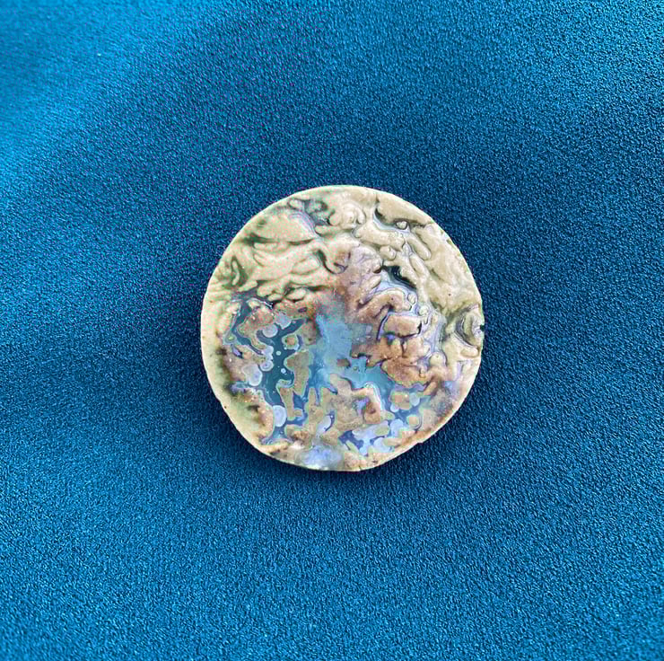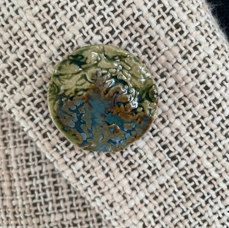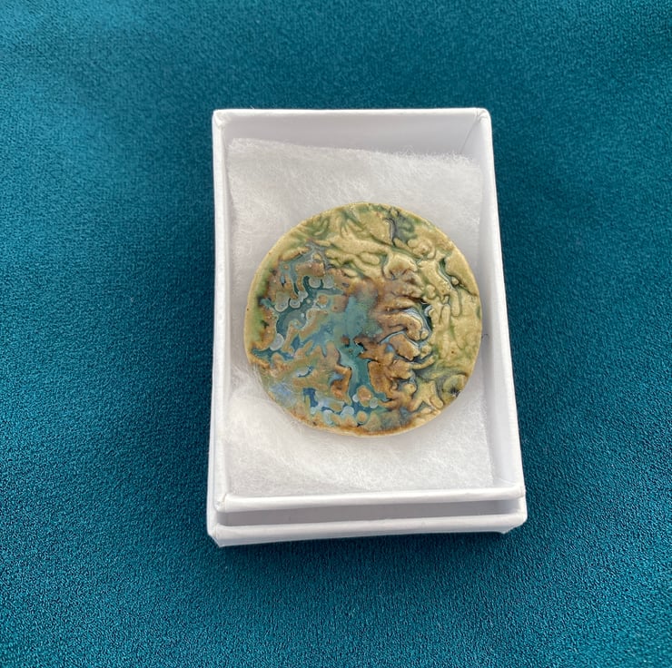 A beautiful handmade small circle ceramic brooch. Glazed in blues and greens stoneware glazes.