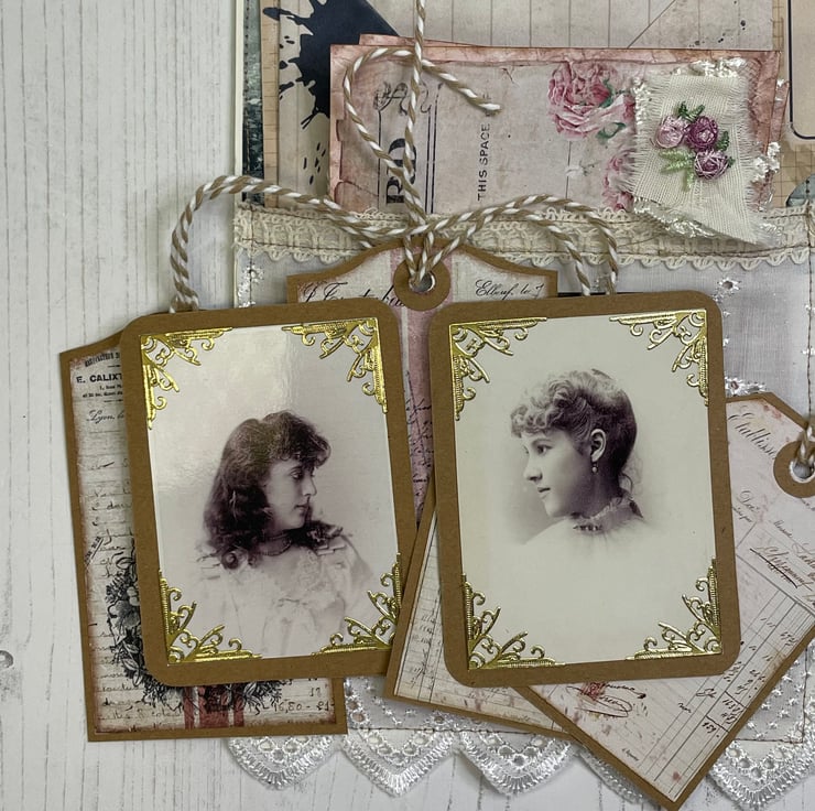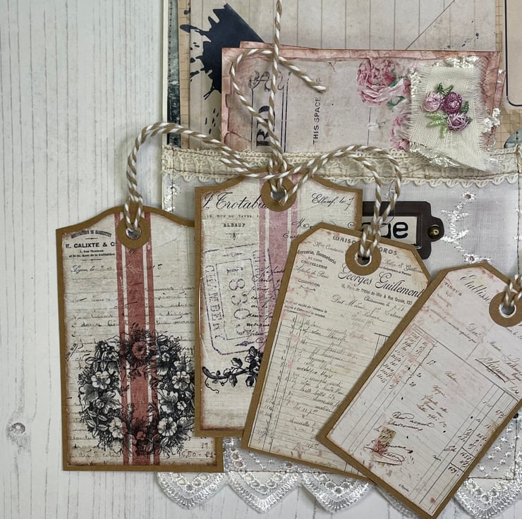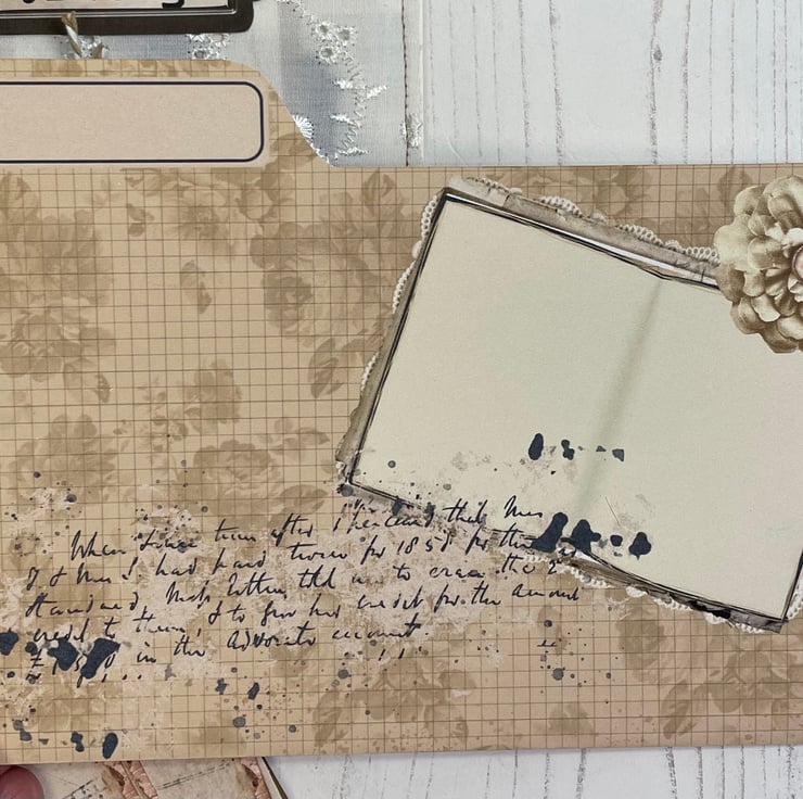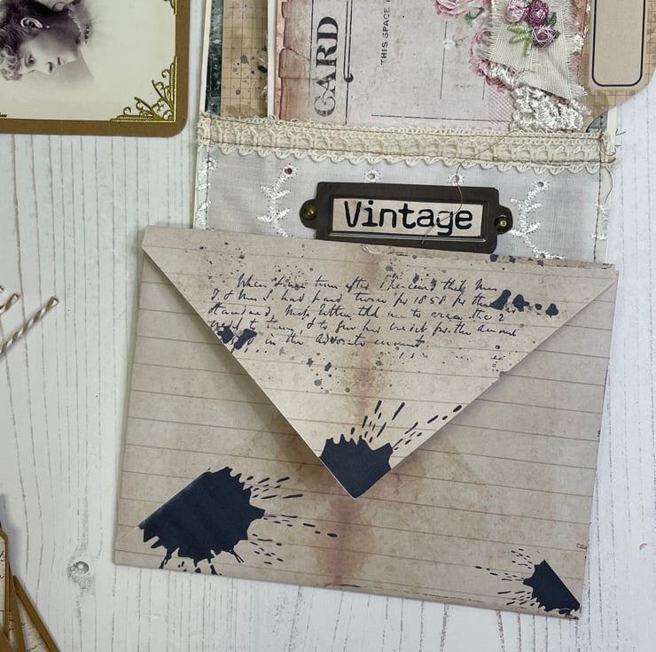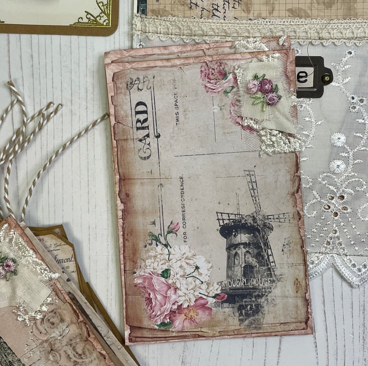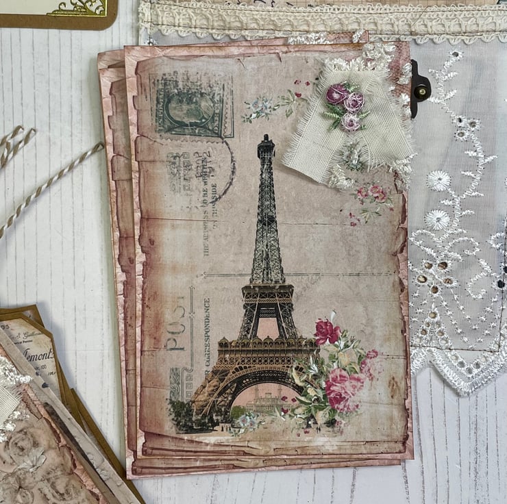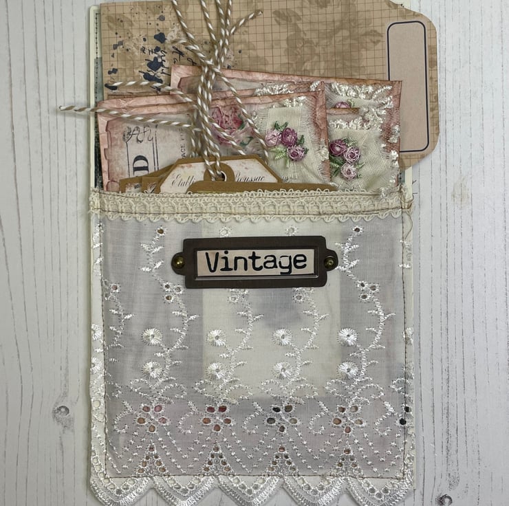 French travel pages stitched kraft card with a cotton Broderie Anglais pocket edged with guipure lace. Contents