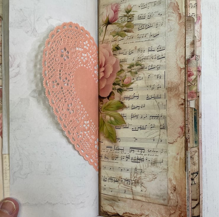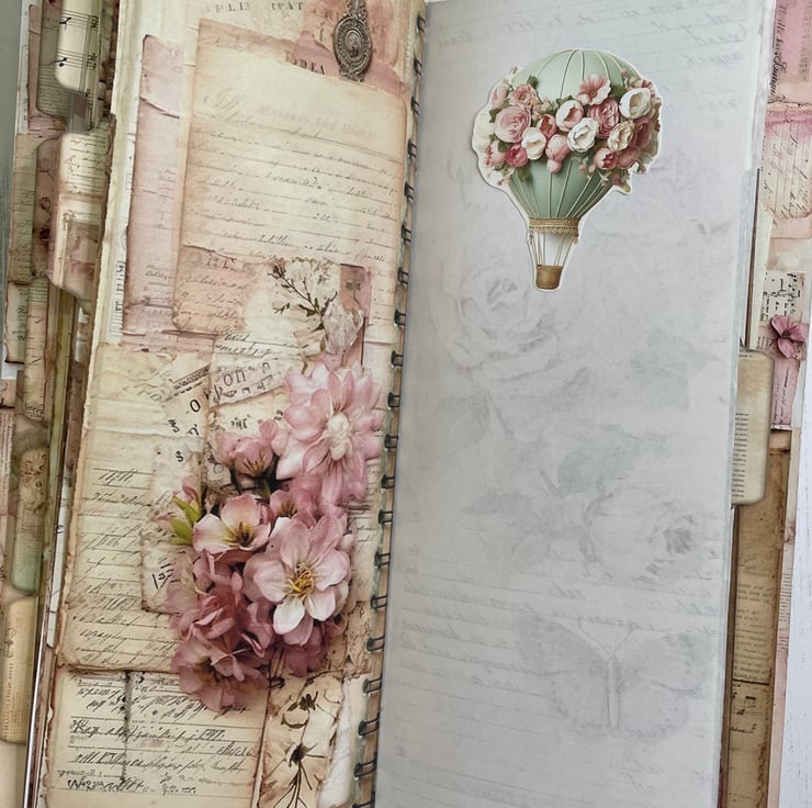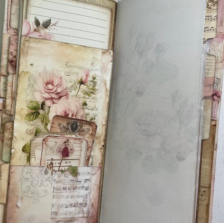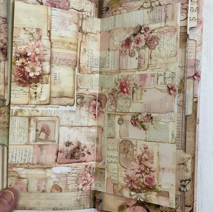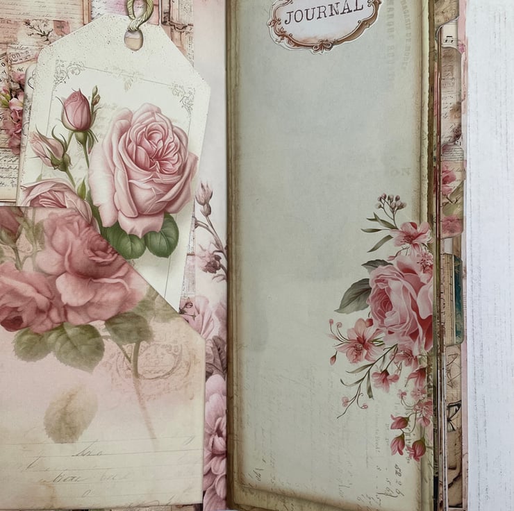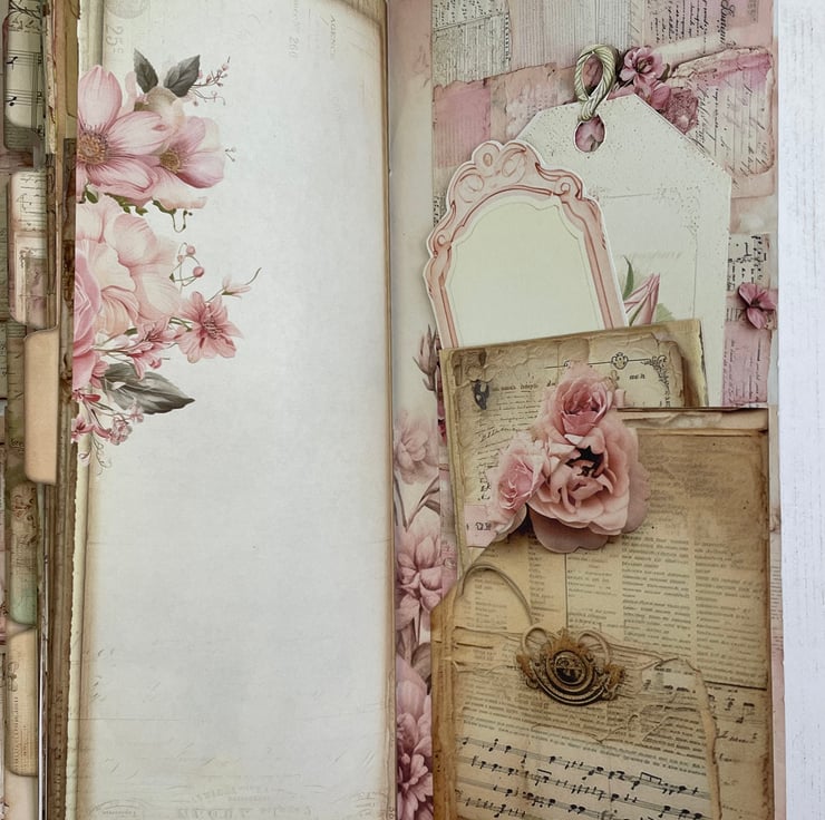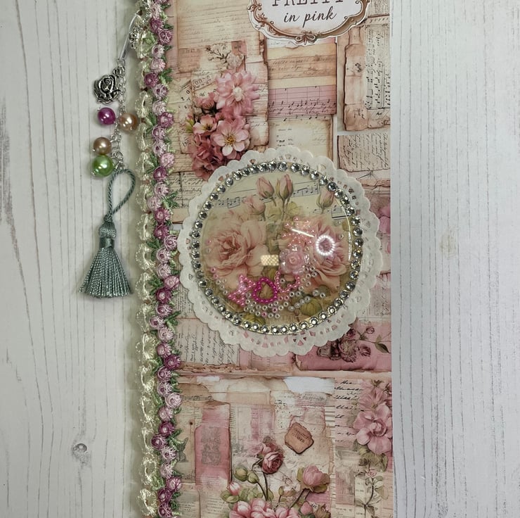 A tall and skinny junk journal in shades of pink. 30 double sided pages. Pockets, tuck spots, flip out tag. Journal cards and tags x 25.